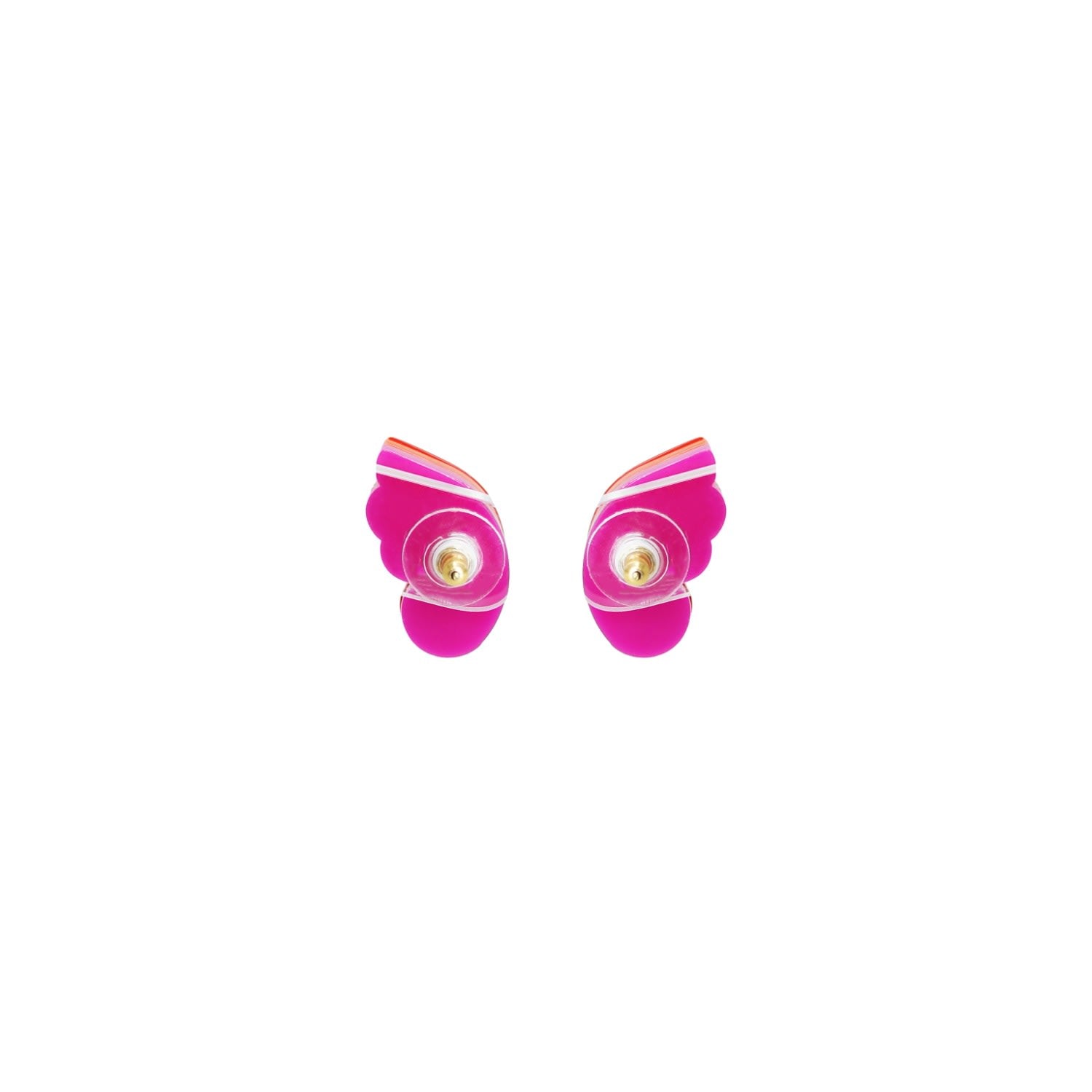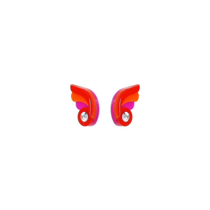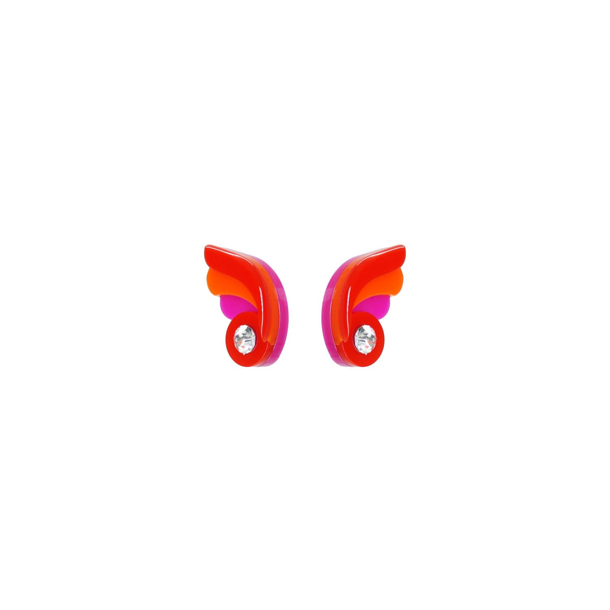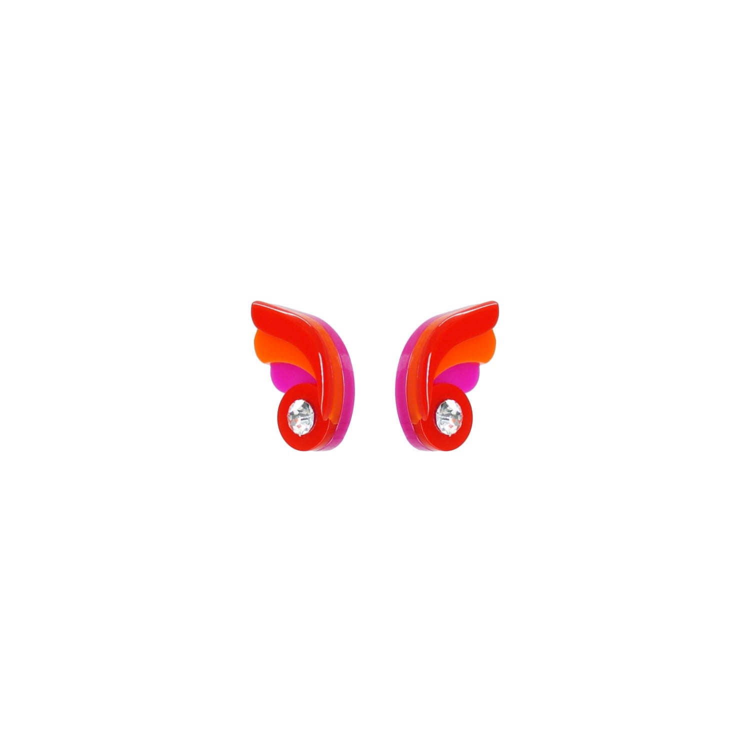 These earrings are handmade by Brazilian artisans. They are made of acrylic with glass rhinestones and have a stainless steel pin. They are shaped like small butterflies.