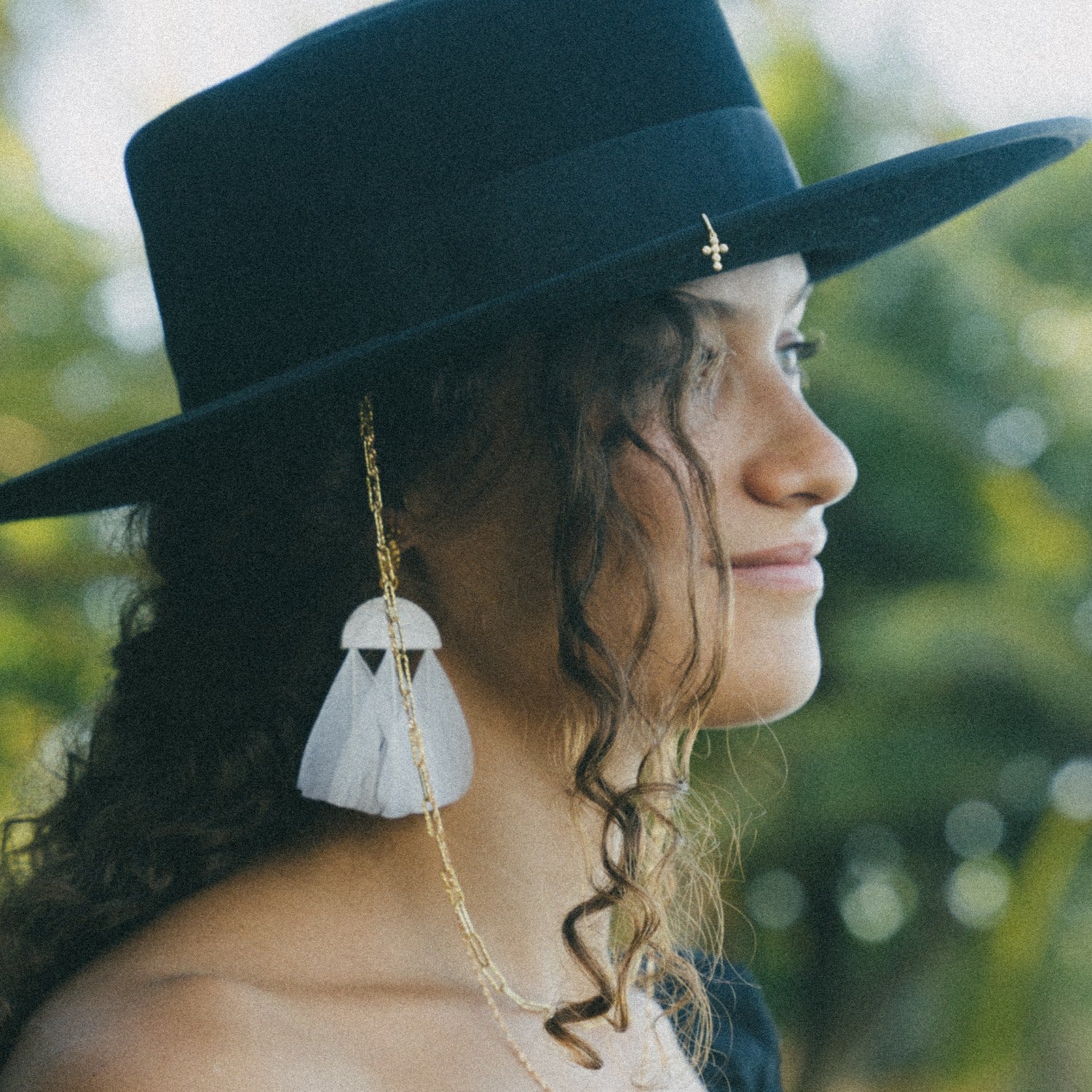 These Jet Set Earrings by Babaloo Jewelry are a pair of stunning statement earrings. They are thoughtfully handcrafted with custom clay elements and ethically sourced molten feathers, making each piece unique. The 18K gold-plated posts are nickel-free and hypoallergenic, and the earrings are extremely lightweight. Their bold design is perfect for adding an artistic and unique touch to your look.