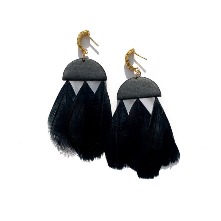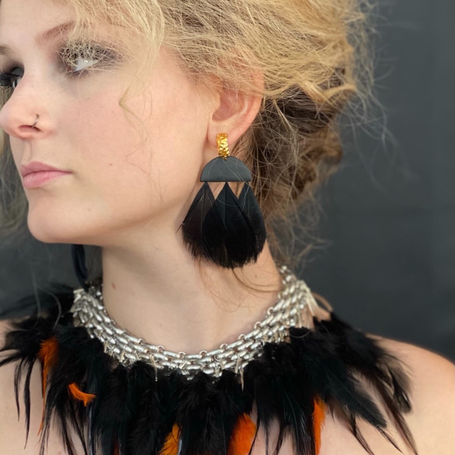 These earrings are handmade with polymer clay and ethically sourced molten feathers. They have 18K gold-plated posts that are nickel-free and hypoallergenic.