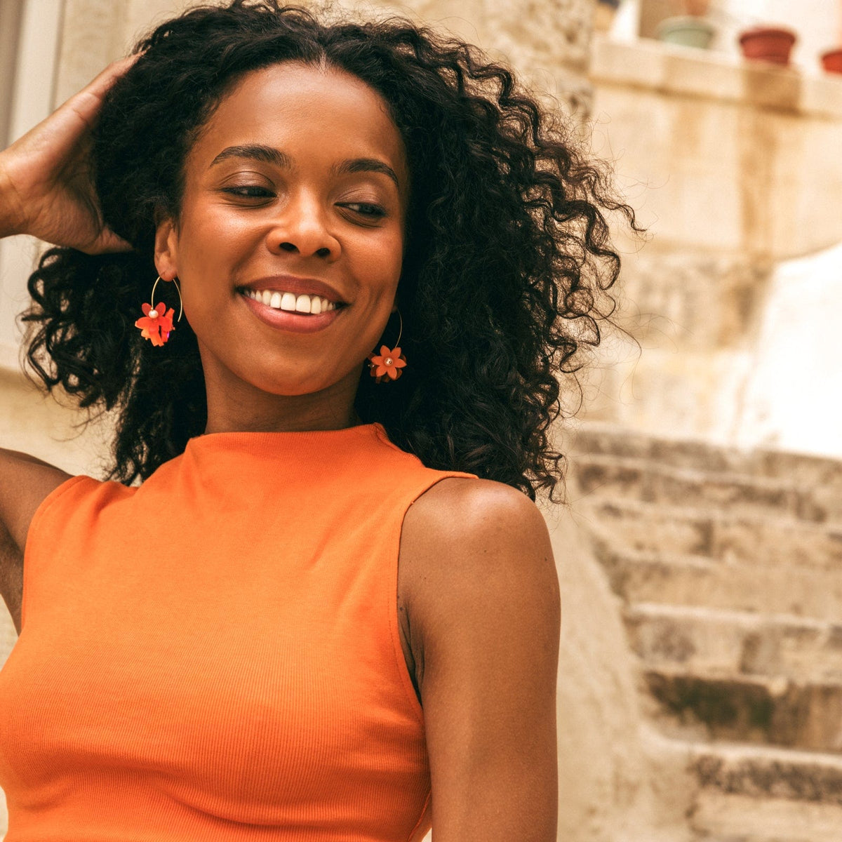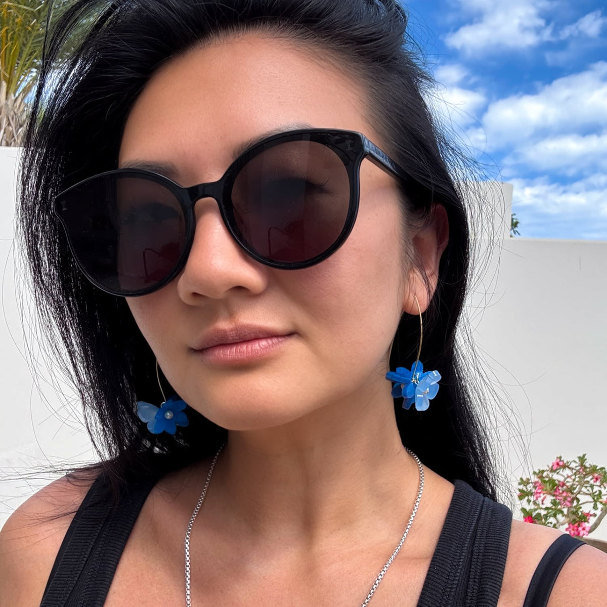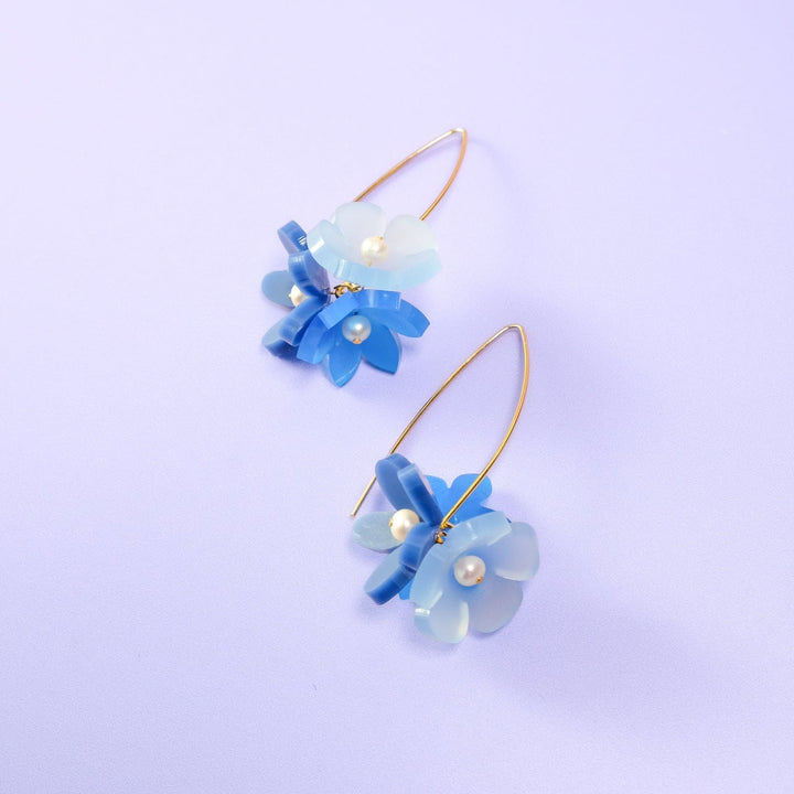 These Flowerball Dangly Earrings In Blue by By Chavelli are a delightful and playful accessory, designed to bring a vibrant pop of color and cheer to any outfit. Crafted from lightweight, laser-cut acrylic, they feature a charming cascade of three-dimensional flowers in different shades of blue. The addition of a freshwater pearl on each flower adds a touch of natural elegance, making them perfect for adding a whimsical and joyful touch to your day.