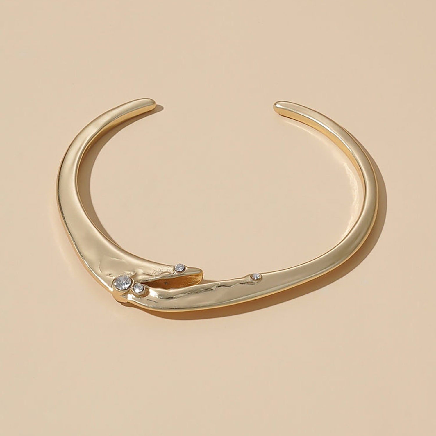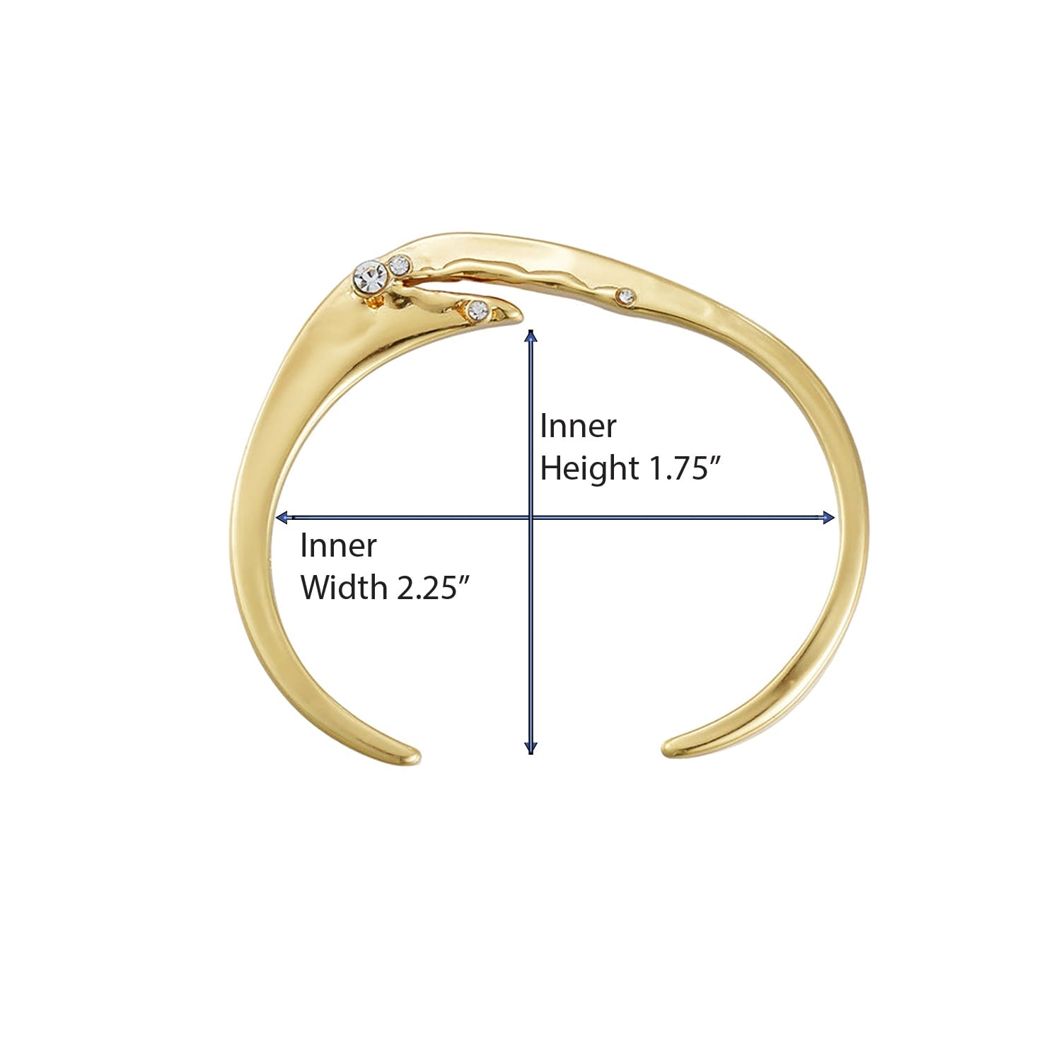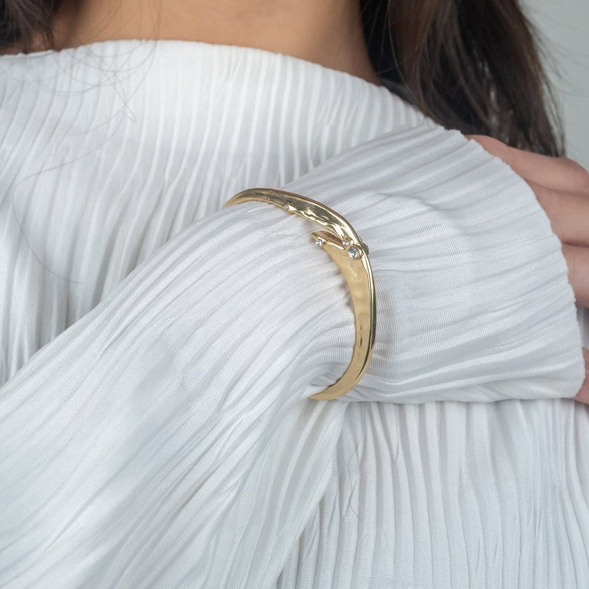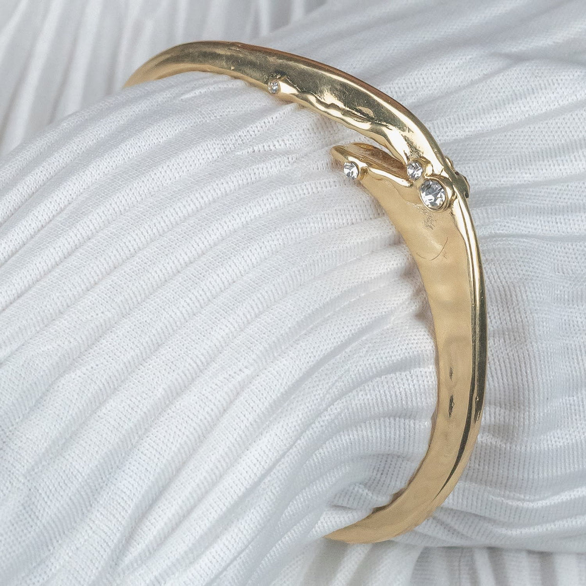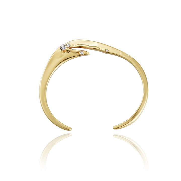 This cuff bangle is made of brass with 14kt real gold plating. It features cubic zirconia stones and has a fluid, sculptural form.