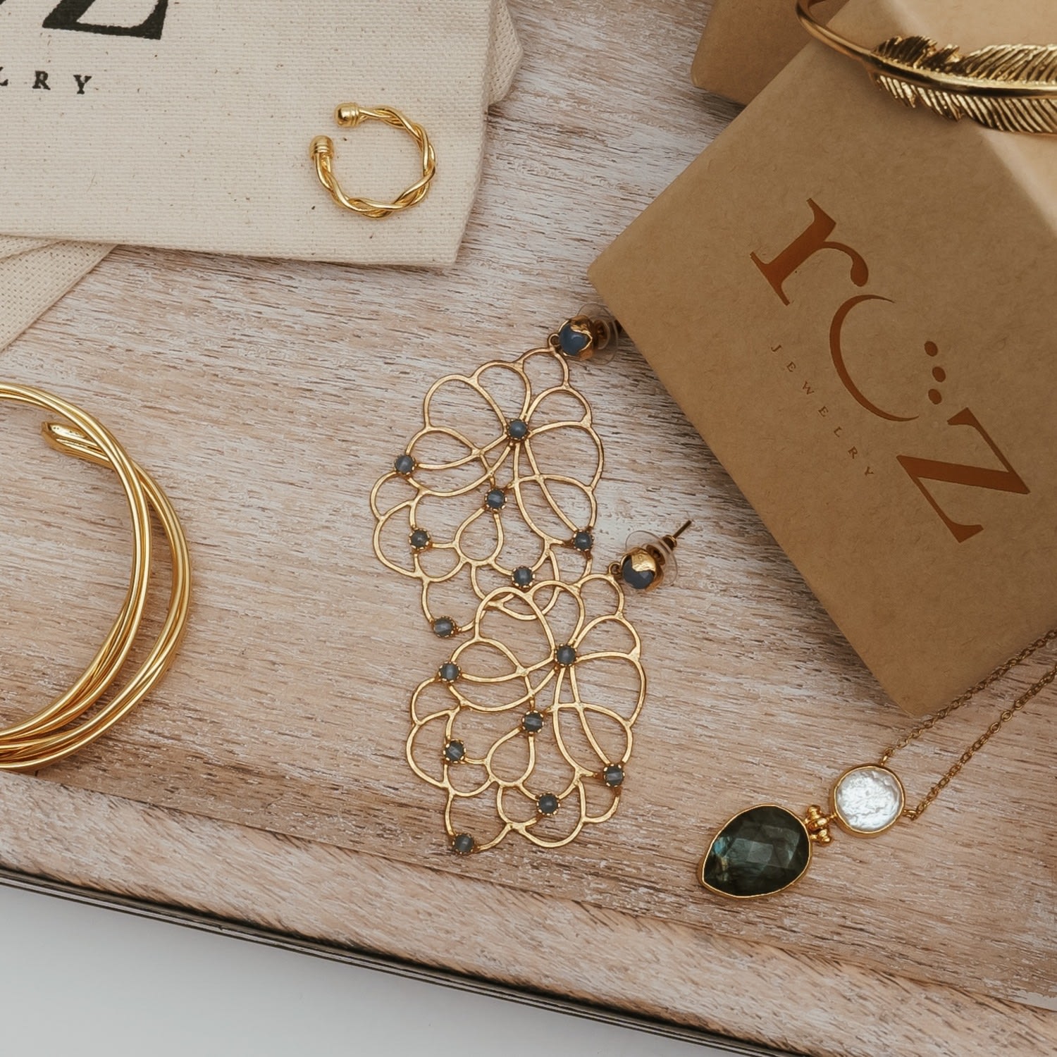 Rōz is a female-founded jewelry brand whose name means “every day” in Urdu. The label creates capsule collections that merge styles from the global north and south to deliver pieces that are both bold and functional. Each design is handmade using brass metal with 21-karat gold plating and a protective lacquer finish. Rōz aspires to elevate daily wear with lasting essentials that balance versatility and statement, offering affordable luxury crafted through direct relationships with local artisans and vendors.