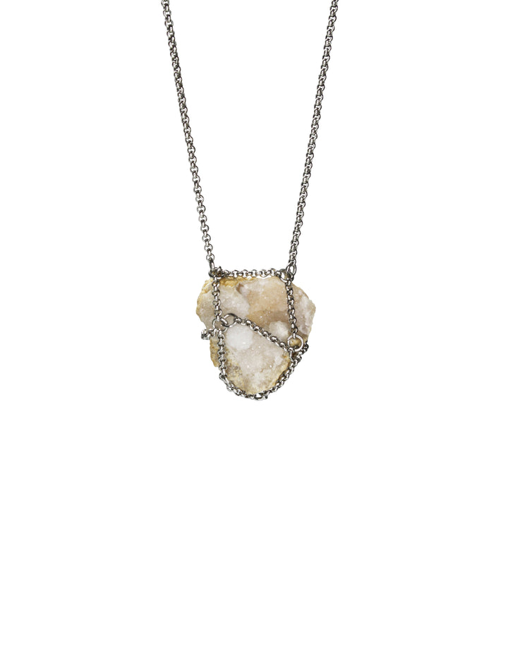 This Caged Druzy Agate Necklace by Mhart is a one-of-a-kind piece that showcases the jaw-dropping beauty of a natural druzy agate gemstone. The stone is intricately caged in a polished stainless steel chain, creating a modern and luxurious design. The natural beauty of the stone radiates when hit by light, making this necklace a true statement of sparkle and confidence.