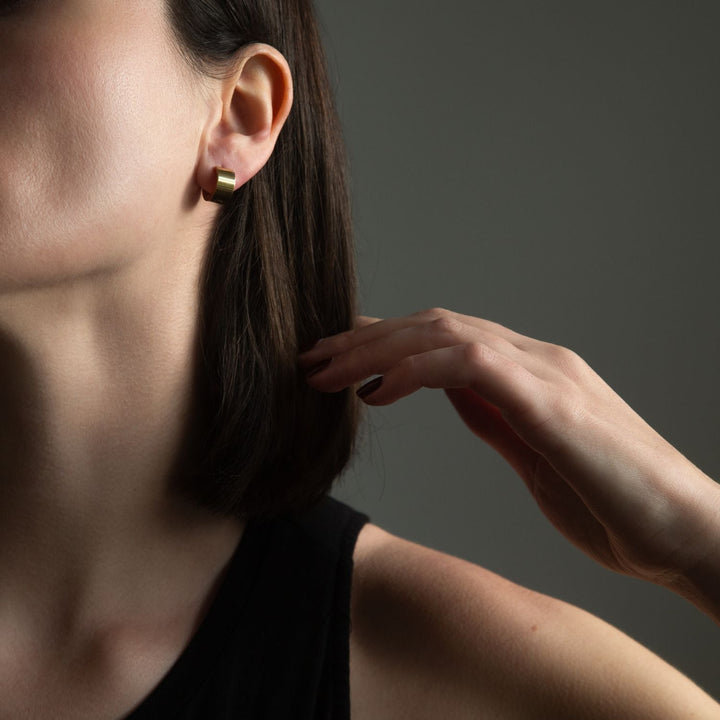These Gold Vera Hoops by A Weathered Penny are a chunky and modern take on a classic hoop. Their substantial size and sleek design make them perfect for everyday wear, whether worn alone or stacked with other earrings for a personalized look. Crafted from durable gold-plated stainless steel, they offer a confident and timeless style.