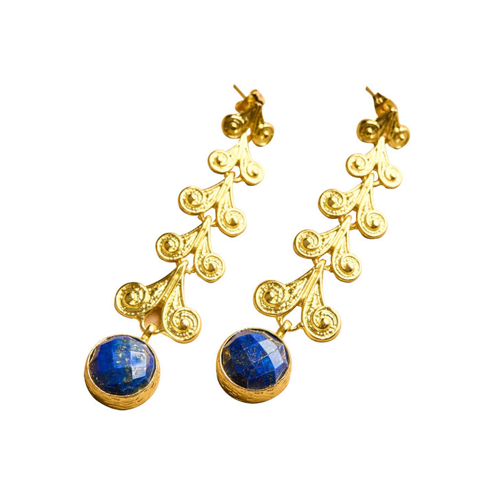 Crafted from 21k gold-plated brass metal, these earrings feature lapis lazuli stones. They have a push-back closure.