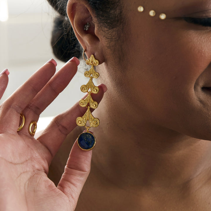 These Jamila Earrings by Rōz are sleek and formal drops that add a touch of sophistication to any elegant affair. The unique coil-shaped motifs, repeated for a long, graceful drop, are finished with a vibrant lapis lazuli stone. These earrings are a beautiful representation of refined style, perfect for creating a polished and striking look.