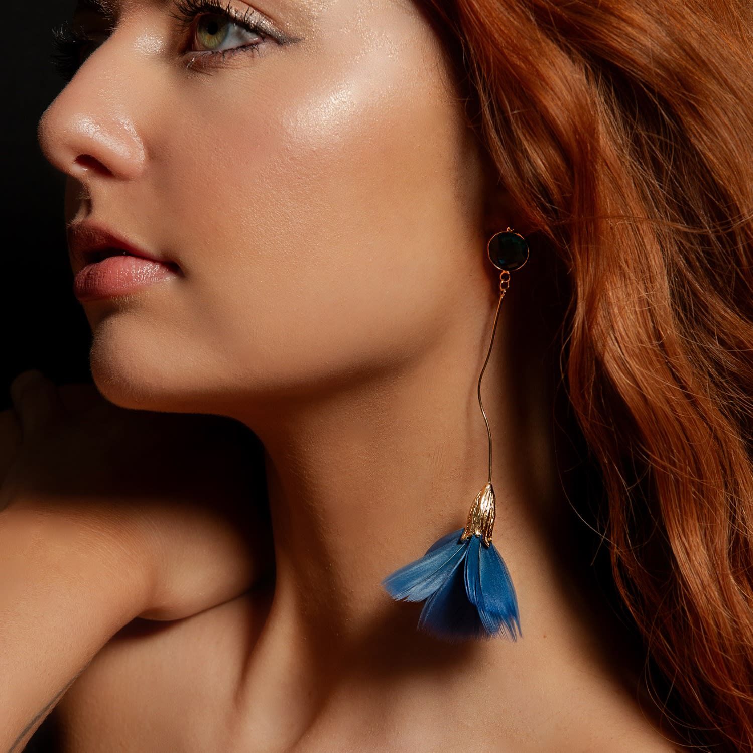 These Blue Blossom Earrings by Babaloo Jewelry are a mesmerizing blend of natural beauty and fluid artistry. They feature deep blue feathers paired with radiant glass studs and gold-tone stems, creating a piece that feels both organic and elegant. Light and airy, they move with you, embodying a sense of effortless grace and free-spirited charm. This unique design is rich in presence, allowing you to make a subtle yet unforgettable statement, evoking the feeling of a tranquil, moonlit garden.