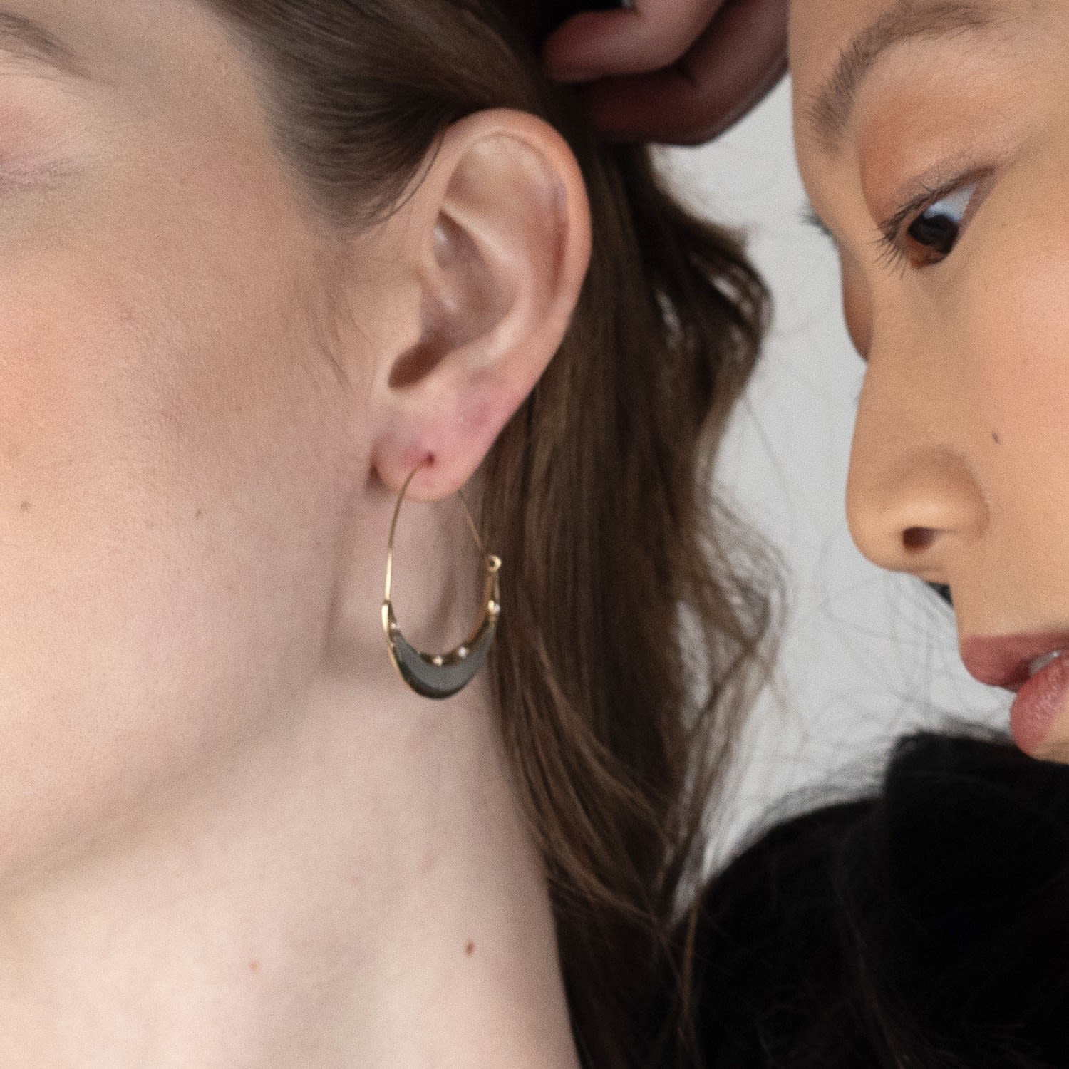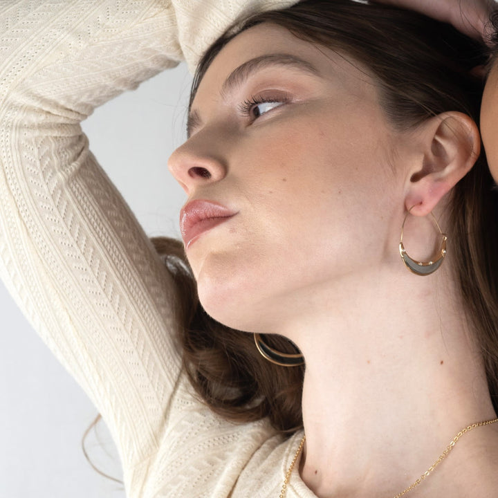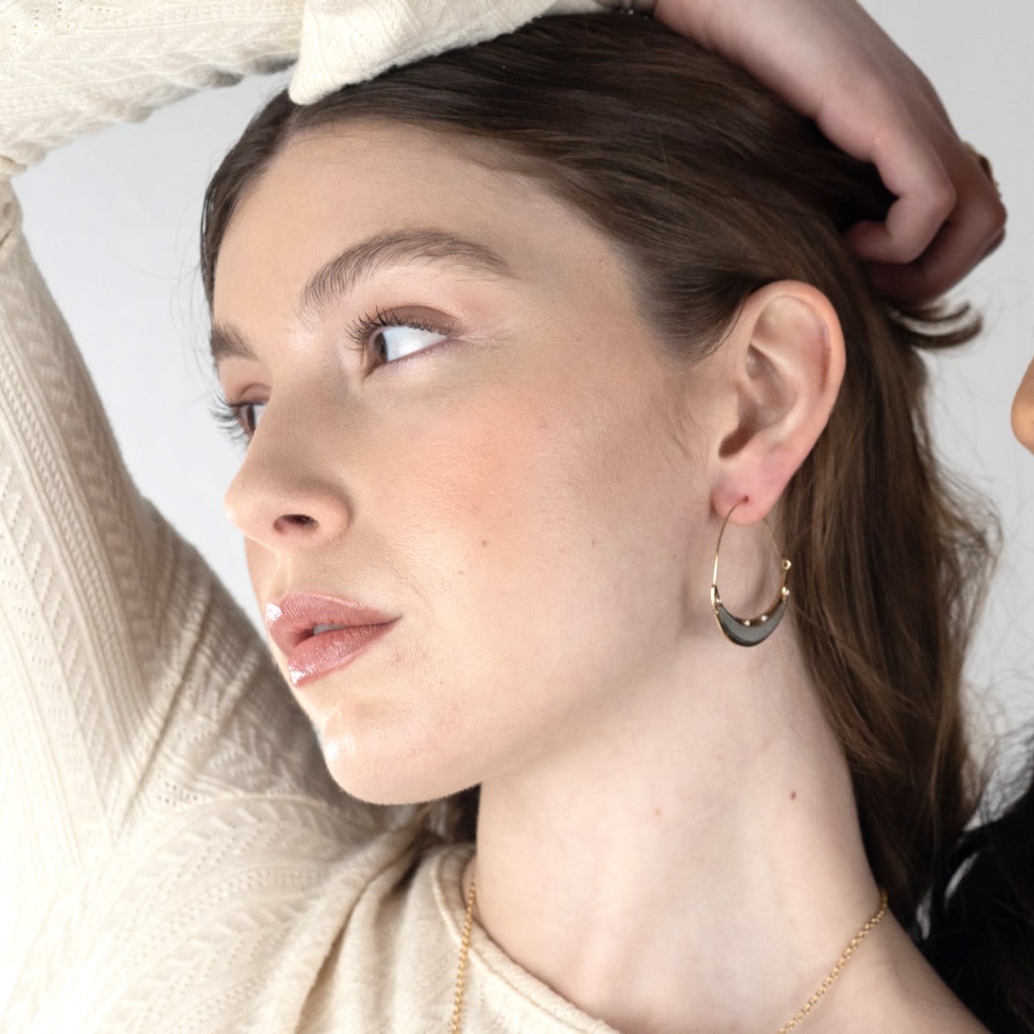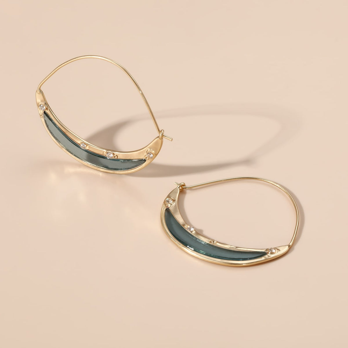 These Crescent Gemstone Blue Hoops Earrings by Rare Matters Jewelry are a beautiful and sophisticated accessory. These lightweight gold earrings feature a crescent shape with a blue glass gemstone set in a bezel frame and enhanced with delicate cubic zirconia accents. Part of the Wabi-Sabi collection, they add a touch of effortless style to any outfit, celebrating the beauty of imperfect, natural forms with a touch of sparkle.