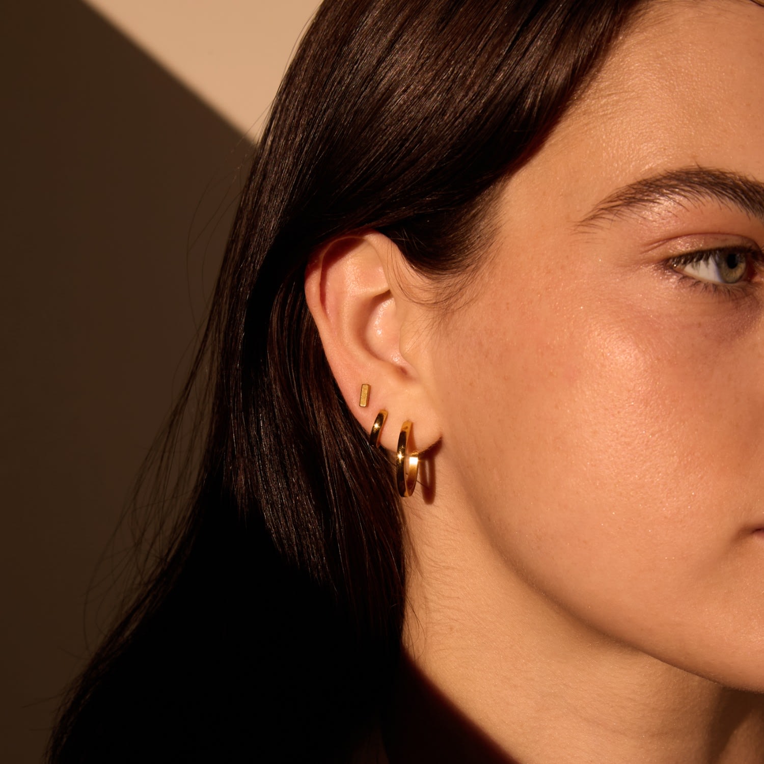 These Gold Lennox Hoops by A Weathered Penny are the perfect accessory for a clean, modern aesthetic. Their simple yet sophisticated design features a flattened base that tapers to a narrow top, adding a subtle edge to the classic hoop silhouette. These versatile earrings are ideal for everyday wear and can be teamed with other hoops to create the ultimate stacked look. They embody effortless style and quiet confidence.