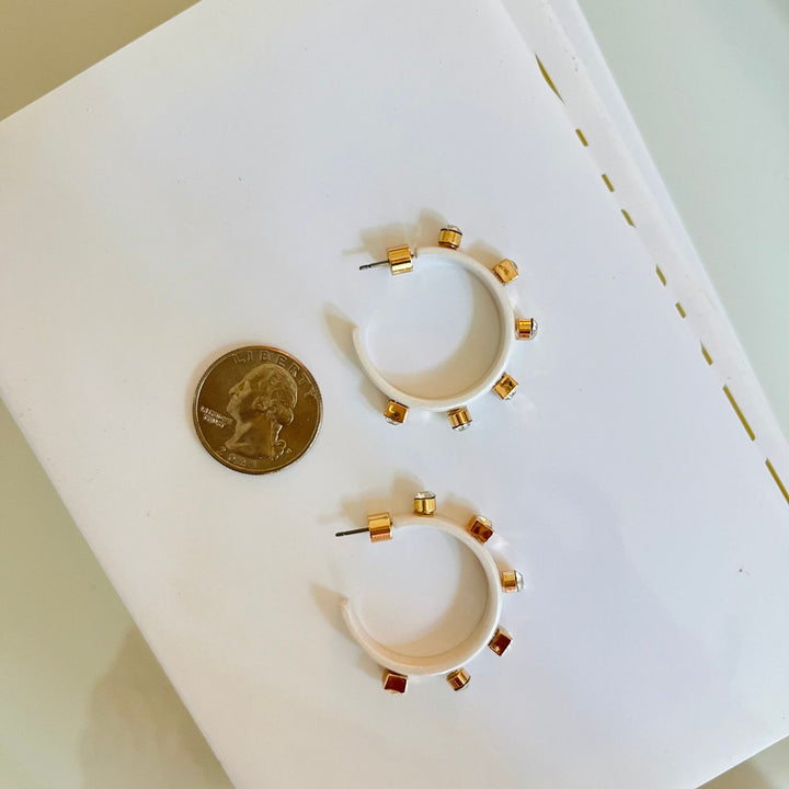 These hoops are crafted from 14k brushed gold-plated metal. They are 1 inch in size and feature an assortment of jewels. They are nickel-free and lead-free.