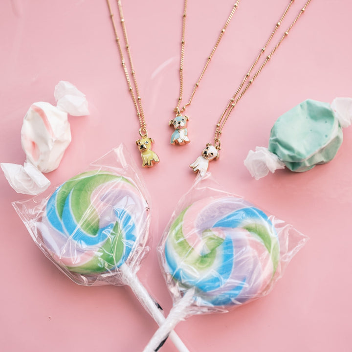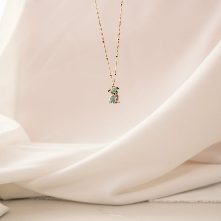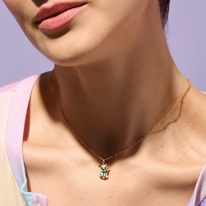 This Cloud Haven Mini Bulldog Sweetie Pendant in Swirl Pop Turquoise by Cloud Haven is a playful tribute to love and rescue. Featuring a charming enamel bulldog pendant plated in gold and suspended from a beaded chain, it celebrates both whimsy and purpose. A layering-ready piece that also supports bully-breed awareness and shelter dog initiatives.