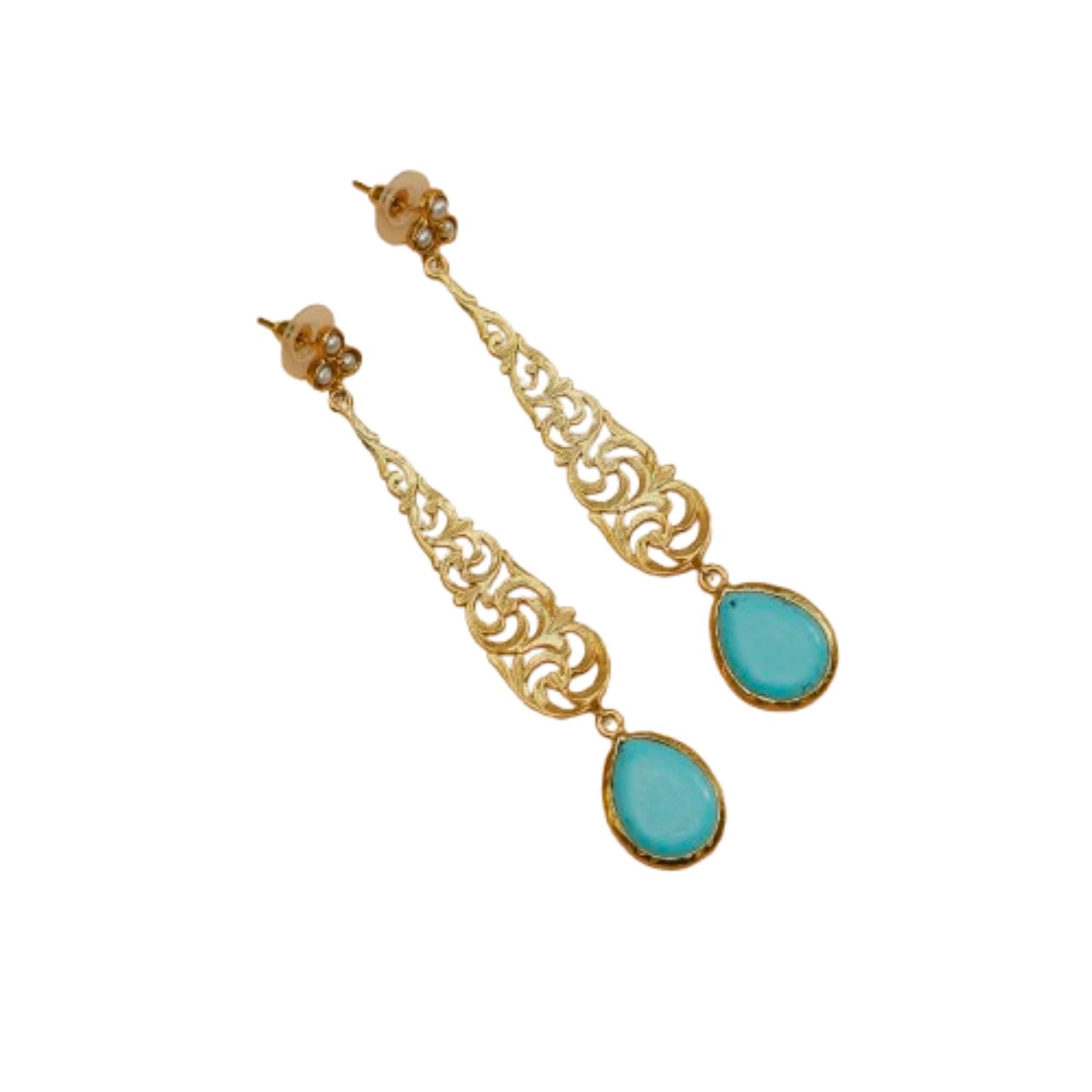 These Avize Earrings - Turquaz by Rōz are a stunning and delicate accessory. The gently ascending chandelier drops feature engraved details, beginning with a pearl trio and finished with tear-drop stones. These earrings are a beautiful piece, perfect for adding a touch of classic elegance and graceful movement to any outfit.