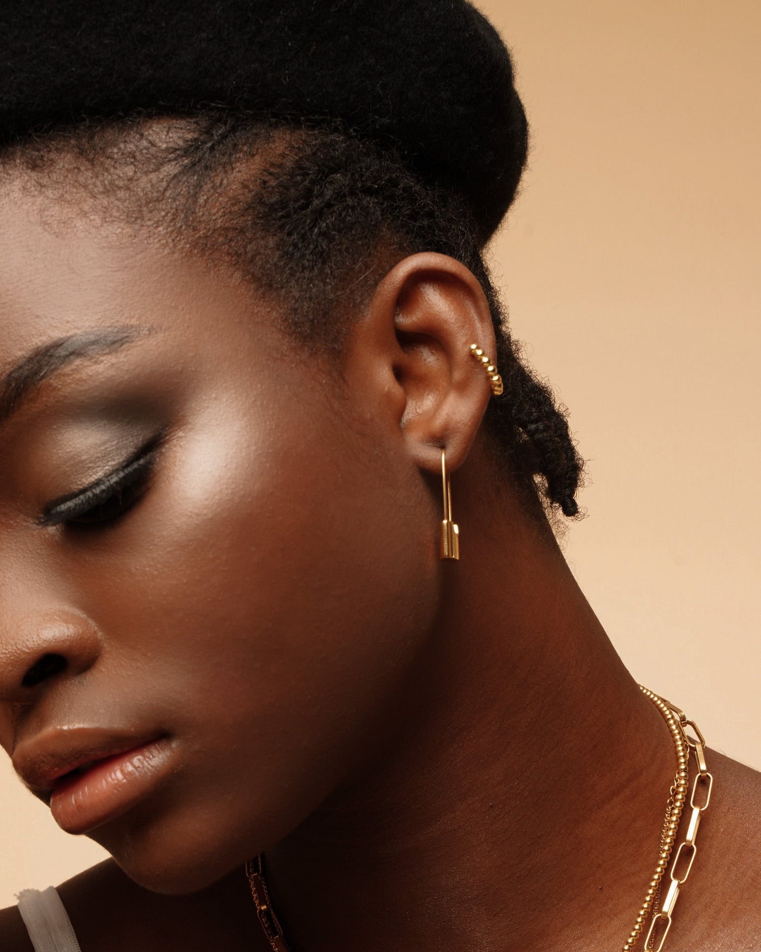 These Julia Ear Cuffs by Viea are sleek and modern adornments designed to hug the ear with understated elegance. Their beaded band texture adds subtle detail, making them perfect for layering with hoops or studs. Waterproof, hypoallergenic, and resistant to tarnish, they are stylish yet practical pieces for everyday wear with contemporary flair.