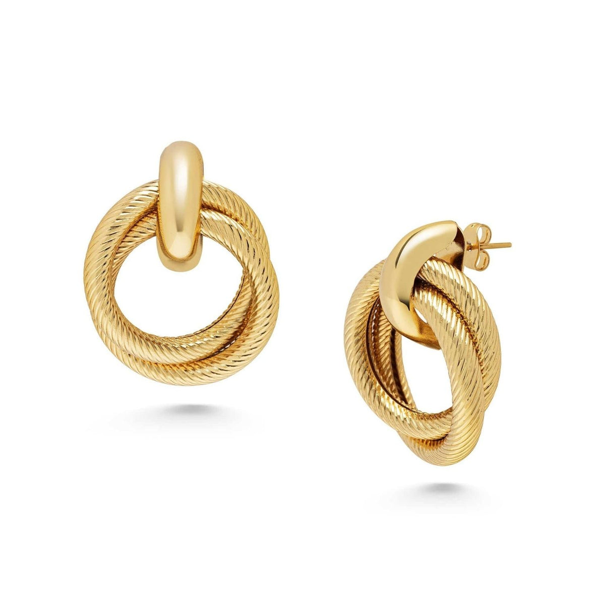 These earrings are crafted from gold-tone metal and feature a twisted rope detailing and interlocked circular shapes.