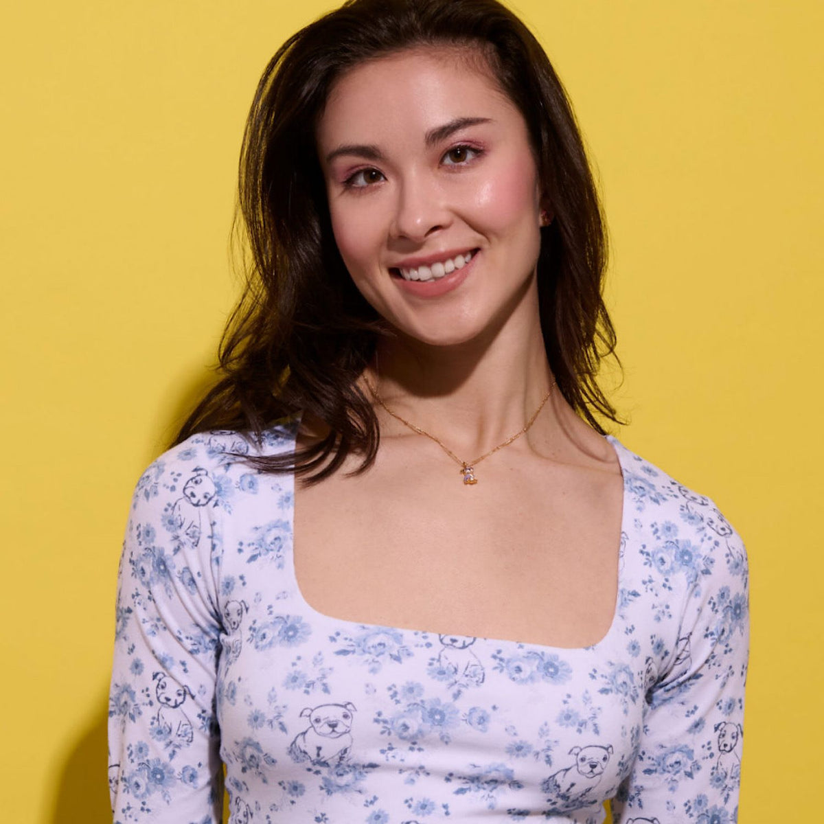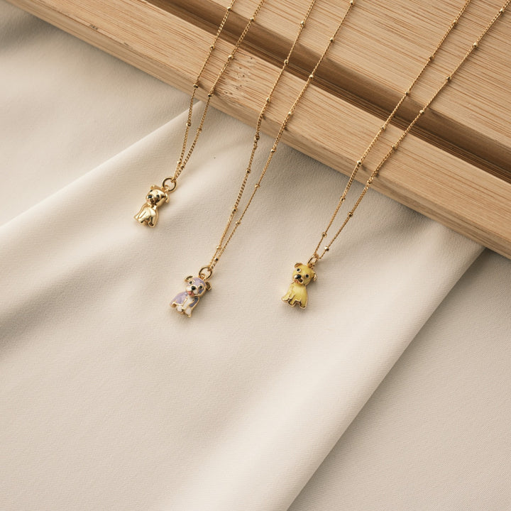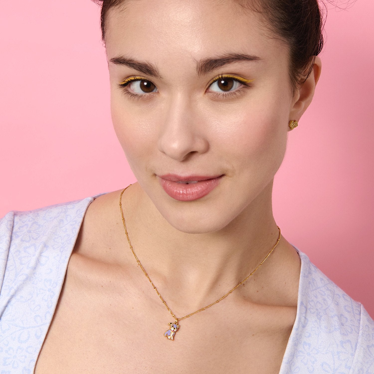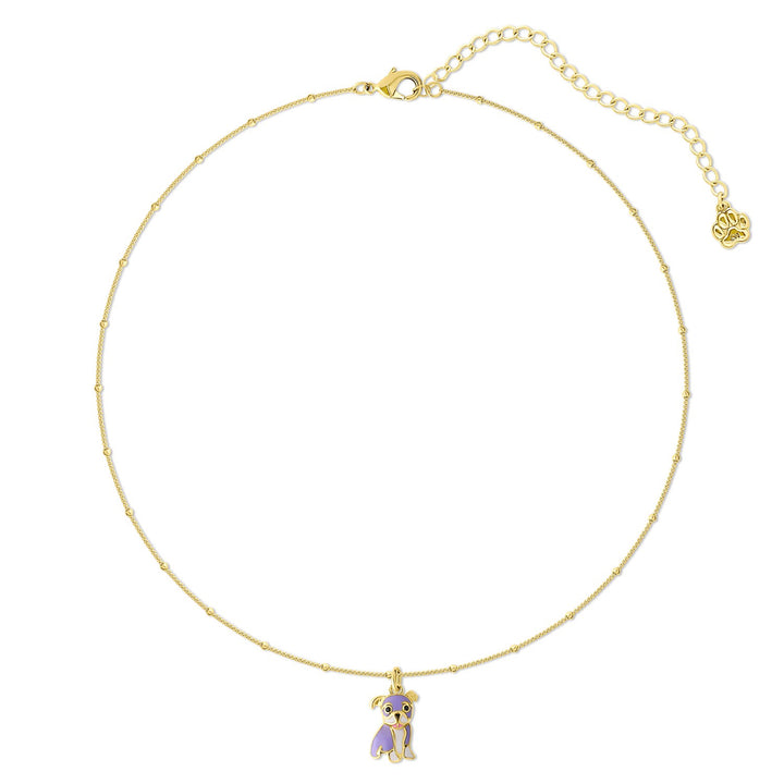 24k gold-plated pendant with enamel in limited-edition color. 15" chain with 3" extender, lobster clasp, paw print tag.