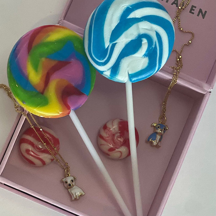 This Cloud Haven Mini Pittie Sweetie Pendant in Lollipop Purple by Cloud Haven is sweet, symbolic, and stylish. Featuring an enamel-plated pendant in limited-edition purple, suspended on a delicate beaded chain, it carries both charm and meaning. Each piece supports awareness for pit bull breeds and contributes to shelter dog rescues, making it a joyful accessory with purpose.