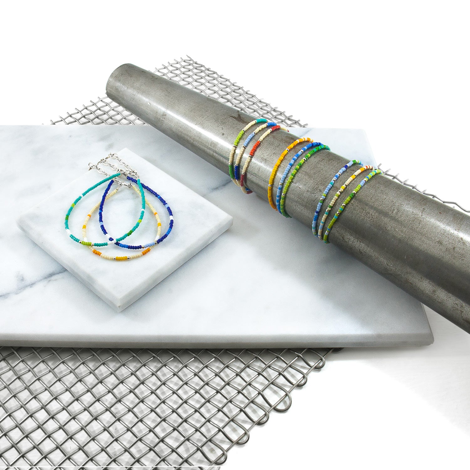 This Blue - Green Ellie Silver & Miyoko Glass Bracelet by Anchor & Crew is a modern-minimalist accessory. It's handcrafted in Great Britain with 3mm diameter genuine multicolored Miyoko glass stone beads in a randomized pattern. The bracelet also features solid .925 sterling silver ball rondelles, a circular lobster clasp, and a 4cm extension chain. It's a stylish and versatile piece for everyday wear.