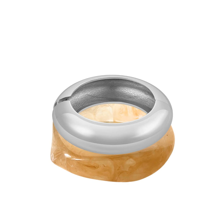 The Alba Bangle Set by Mg Jewelry is an elegant and versatile accessory. This chunky bangle set is crafted from silver and resin, perfect for effortless stacking. The silver bangle features a convenient hinge for easy wear, and the set is eco-friendly with no nickel, chromium, or lead.