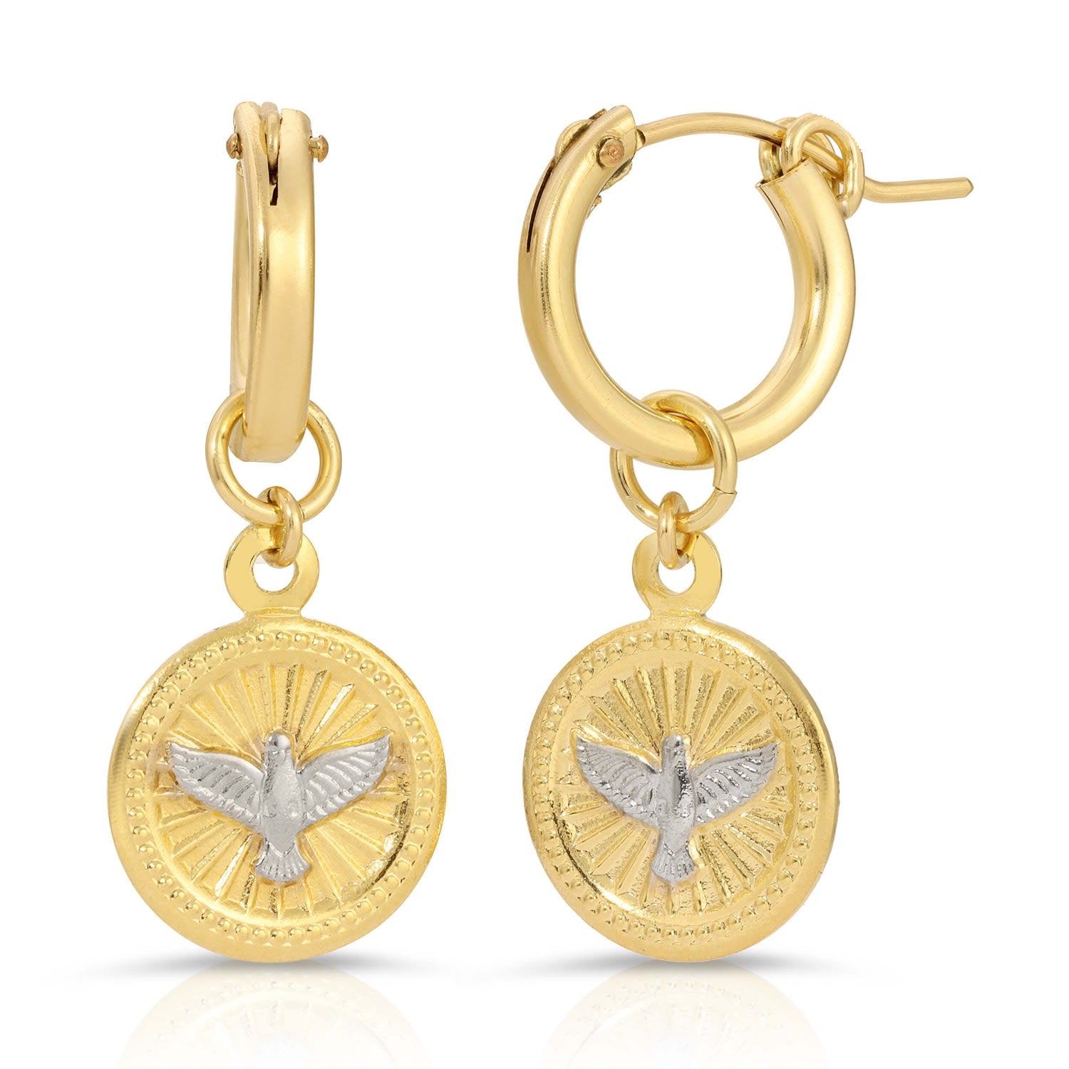 These White Winged Dove Charm Huggie Hoop Earrings by Glamrocks Jewelry are a whimsical and elegant accessory inspired by Stevie Nicks and a "backyard bird kingdom." The white and gold dove charms hang gracefully from 14K gold-filled huggie hoops, creating a charming and delicate look. This piece is a beautiful expression of lyrical inspiration and adds a touch of bohemian grace to your style.