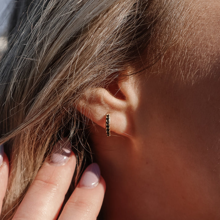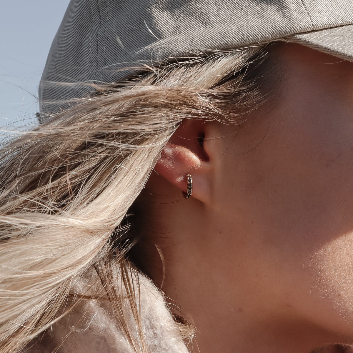 The Adorned Huggies Gold & Black by Cartilage Cartel are a jewelry box staple. These demi-fine hoops are adorned with beautiful black cubic zirconia (CZ) stones and feature an easy-to-use clicker fastening. Perfect for everyday wear, they are an ideal addition to your ear stack. They are made from 925 sterling silver and are 18ct gold-plated, with a protective e-coat layer to prevent tarnishing.