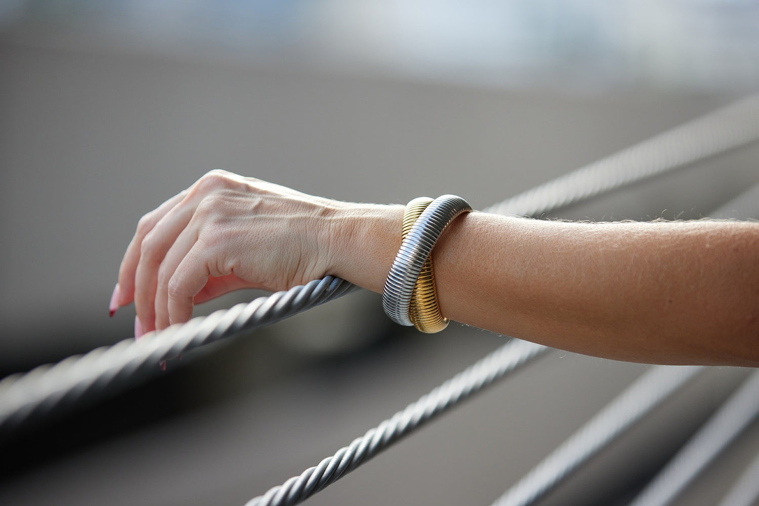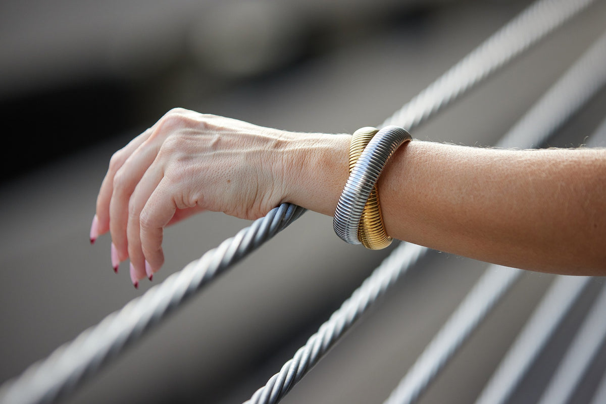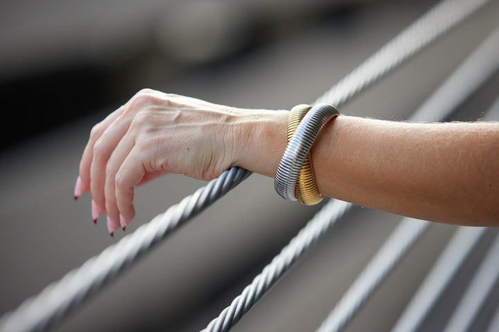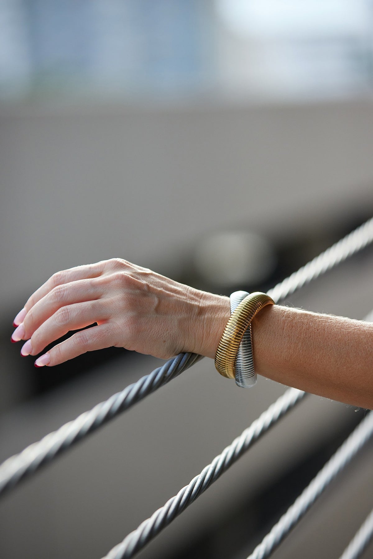 This Interlocked Stretch Bangle by Adriana Pappas Designs is a trendy yet timeless accessory. The unique, handcrafted interlocked design is versatile enough to be dressed up for evening or down for day. This beautiful bracelet will quickly become a favorite in your wardrobe, effortlessly taking you from the beach to brunch and beyond.