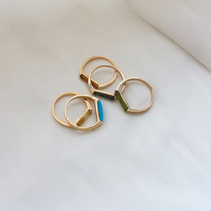 This 14K Gold Plated Slim Stacking Ring - Blue & Gold by Preeti Sandhu has a clean, architectural sensibility that highlights the stunning color of the natural Turquoise baguette. Handcrafted in 14k gold-plated sterling silver, it features a slim band with a claw set stone, creating a minimalist look that is gorgeous alone or stacked. This ring is perfect for both casual and formal ensembles, offering a contemporary aesthetic with a touch of natural beauty.