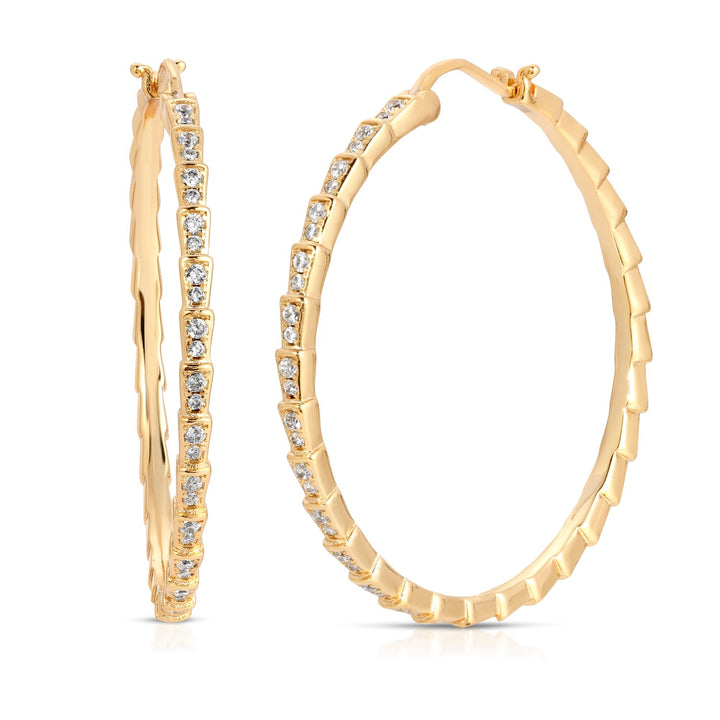 These hoops are crafted from heavy gold-plated brass with gold-plated sterling silver ear pins and feature pavé cubic zirconia.