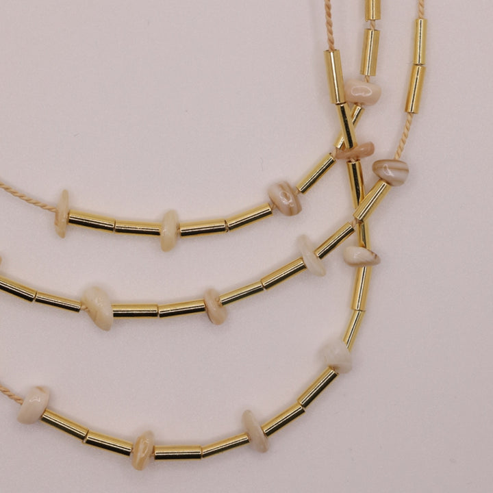 This necklace is made with three layers of buriti natural fiber, mother-of-pearl beads, and gold-plated connectors. It has an adjustable length from 20cm to 24cm (7.8-9.4 inches).