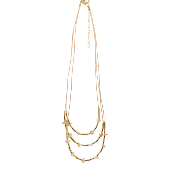 This The Beads Layers Buriti Natural Fiber Necklace by Nart Nature Making Art is a beautiful and delicate accessory. It features three layers of buriti natural fiber with mother-of-pearl beads and gold-plated connectors. This versatile necklace enhances any look and can be paired with other pieces from the Buriti Collection. Its adjustable length makes it a comfortable and unique statement piece.