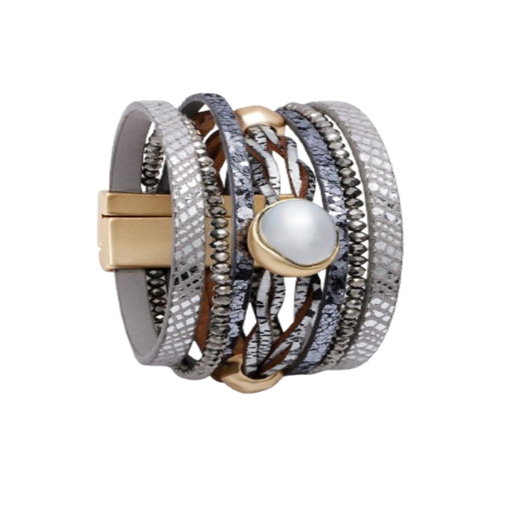 This bracelet features a braided leather strand and is highlighted by a radiant orb and textured beads. It is finished with a magnetic clasp.