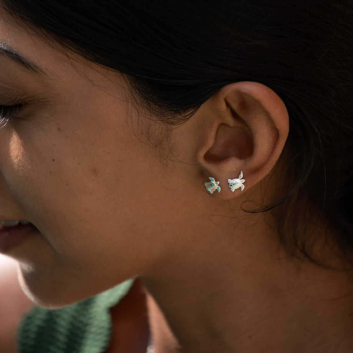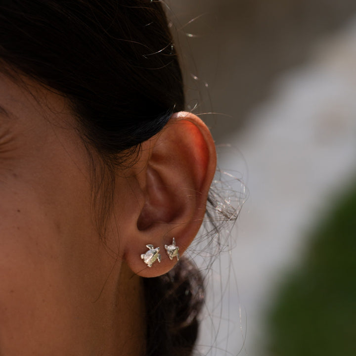 Recycled 925 sterling silver. Turtle motif with detailed shell and beak. Stud earring design with butterfly backs.