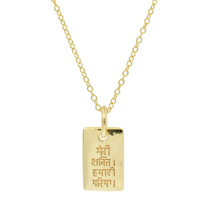 This Mini Restore Dignity Amulet by Kamaria is a symbolic and meaningful accessory. The amulet is inscribed in Hindi with "Your Power, Our Dignity" and reflects the belief that we all hold power to uplift others. It is made from 14k gold plate over 925 sterling silver and has an adjustable slider clasp, up to 46cm. The unalome on the back symbolizes wisdom and life's winding path toward enlightenment.