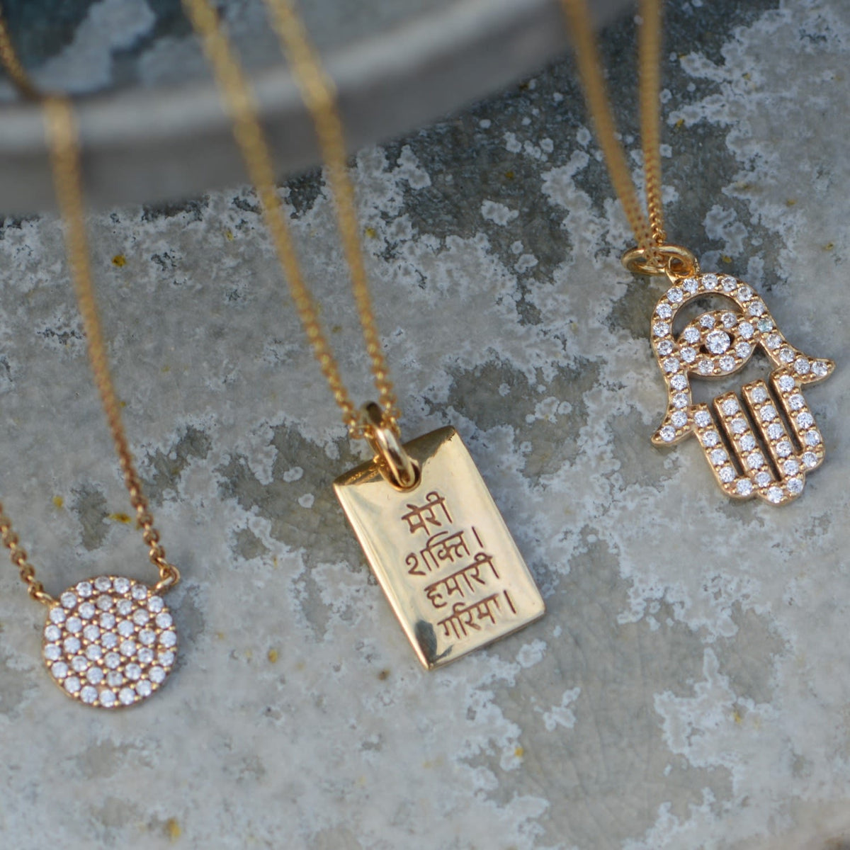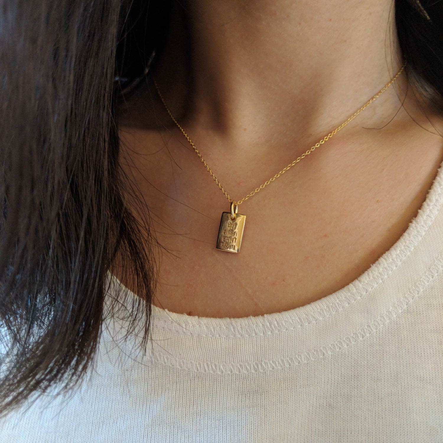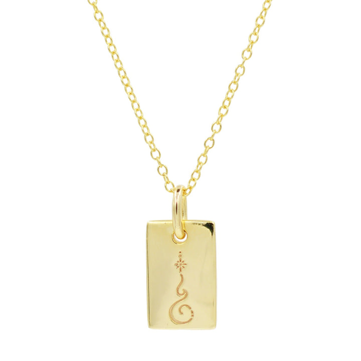 This amulet is made from 14k gold plate over 925 sterling silver. It has an adjustable slider clasp up to 46cm. The amulet has inscriptions and a unalome symbol.