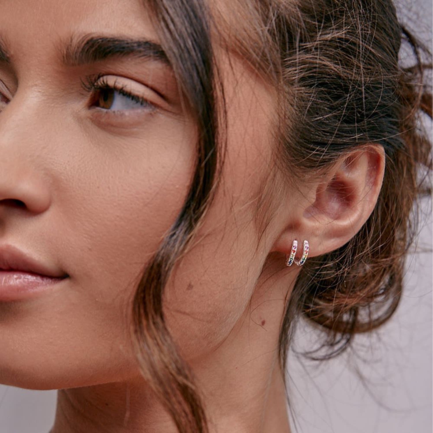 These huggie hoop earrings are made from an unspecified metal (likely sterling silver) and feature rainbow stones.