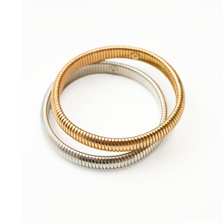This bracelet features a sleek, coiled design with a flexible, ribbed texture.