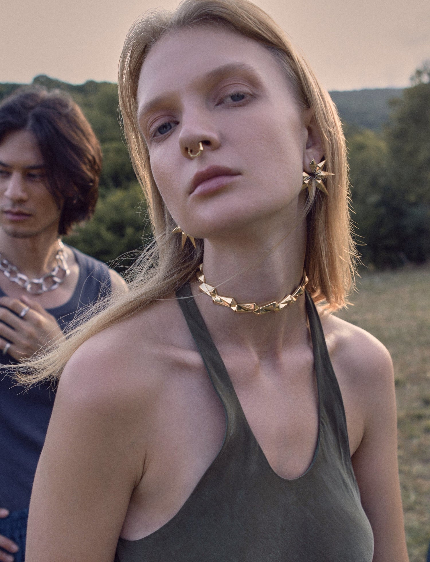 This Nimble Lip and Ear Cuff by Mishka captures the fluid grace of wild animals with its sculptural curves. Striking yet versatile, its elastic structure allows it to be worn on the ear, lips, or nose, offering a bold, gender-fluid expression of style. An avant-garde piece that adds sophistication with an edge.