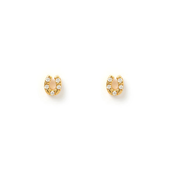 These Lucky Horseshoe Gold Studs by Arms of Eve are an elegant and graceful accessory. The horseshoe studs are adorned with shimmering cubic zirconia, adding a touch of grace and positive energy to your style. These are perfect for everyday wear and a subtle way to carry a touch of fortune with you.