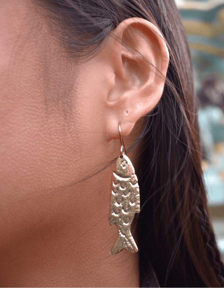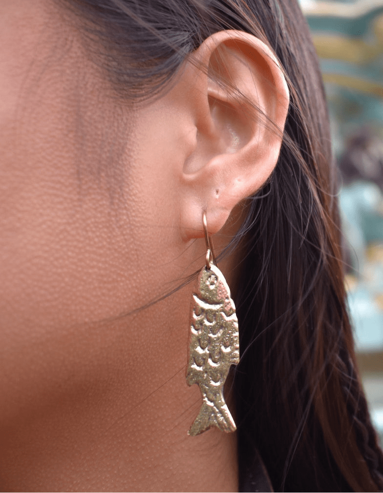 These iconic Fish Earrings by Bambaz are a testament to handcrafted artistry with a coastal theme. Made from 100% solid brass, each earring features a detailed fish silhouette with textured, hammered, and etched scales that beautifully reflect light, creating a sense of dynamic movement. The warm brass tone complements all skin tones, while the lightweight design ensures comfortable wear. These versatile earrings are perfect for adding a touch of nautical elegance to any outfit and are sure to be a conversation starter, making them ideal for both beach vacations and everyday charm.