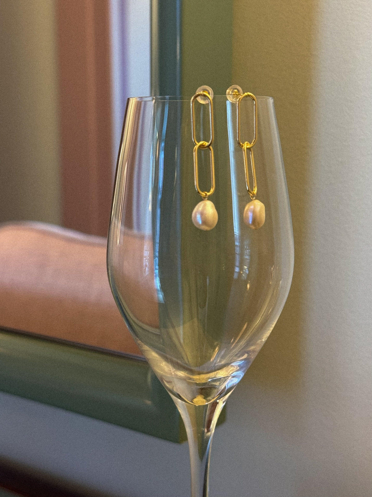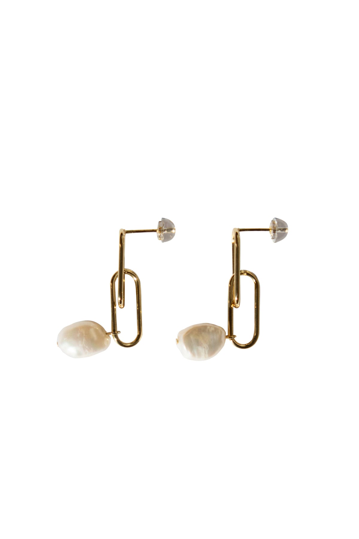 These earrings are crafted from 14k gold-plated sterling silver links with freshwater pearls.