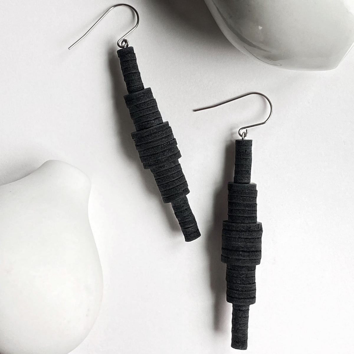Individually punched genuine leather sequins. Hypoallergenic stainless steel hooks. Lightweight and sustainable materials.