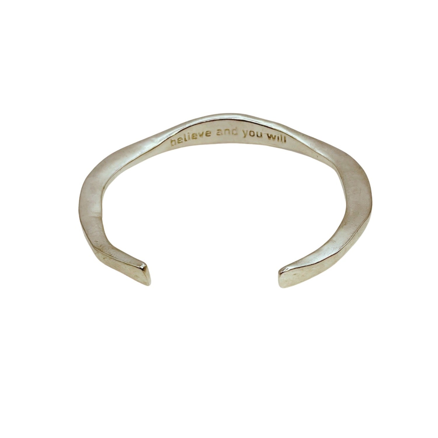 This cuff is sterling silver plated. The specific base metal is not mentioned. It is inscribed with the words "believe and you will."