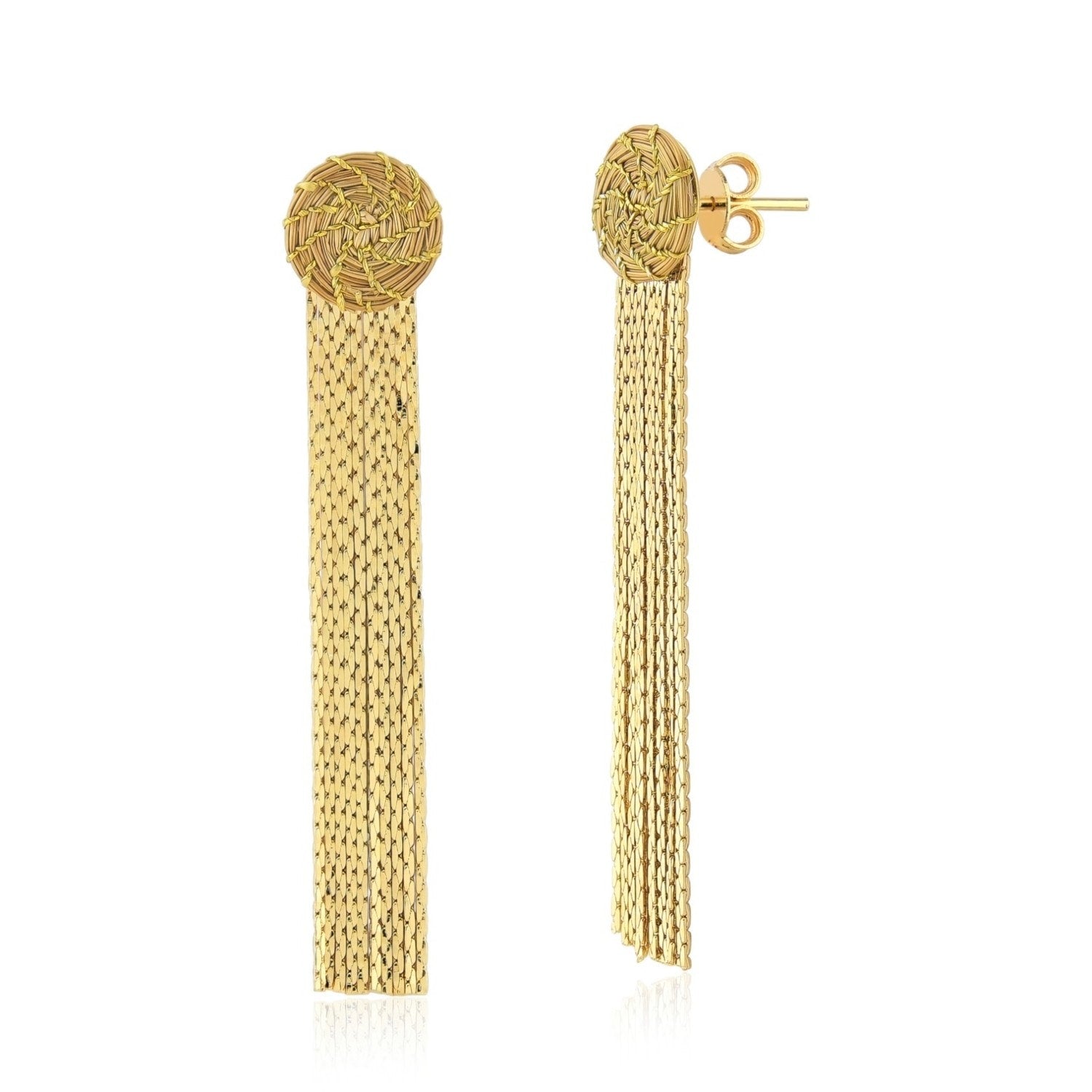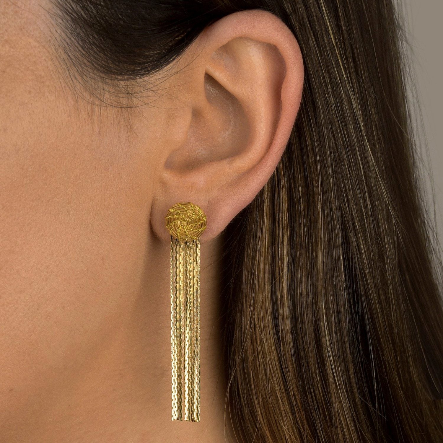 These earrings are handcrafted from 18K gold-plated recycled brass and natural golden nylon thread. They are nickel-free and hypoallergenic.