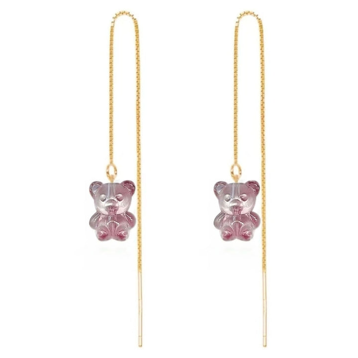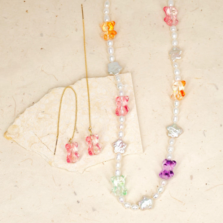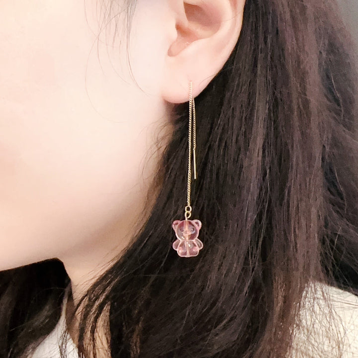 The Crystal Bear Threader Earrings by Ninemoo in Pink are a blend of charm and sophistication. They feature whimsical bear pendants made of glass and are perfect for adding a playful touch to any occasion. They are designed to be paired with other pieces from the collection for a coordinated look.
