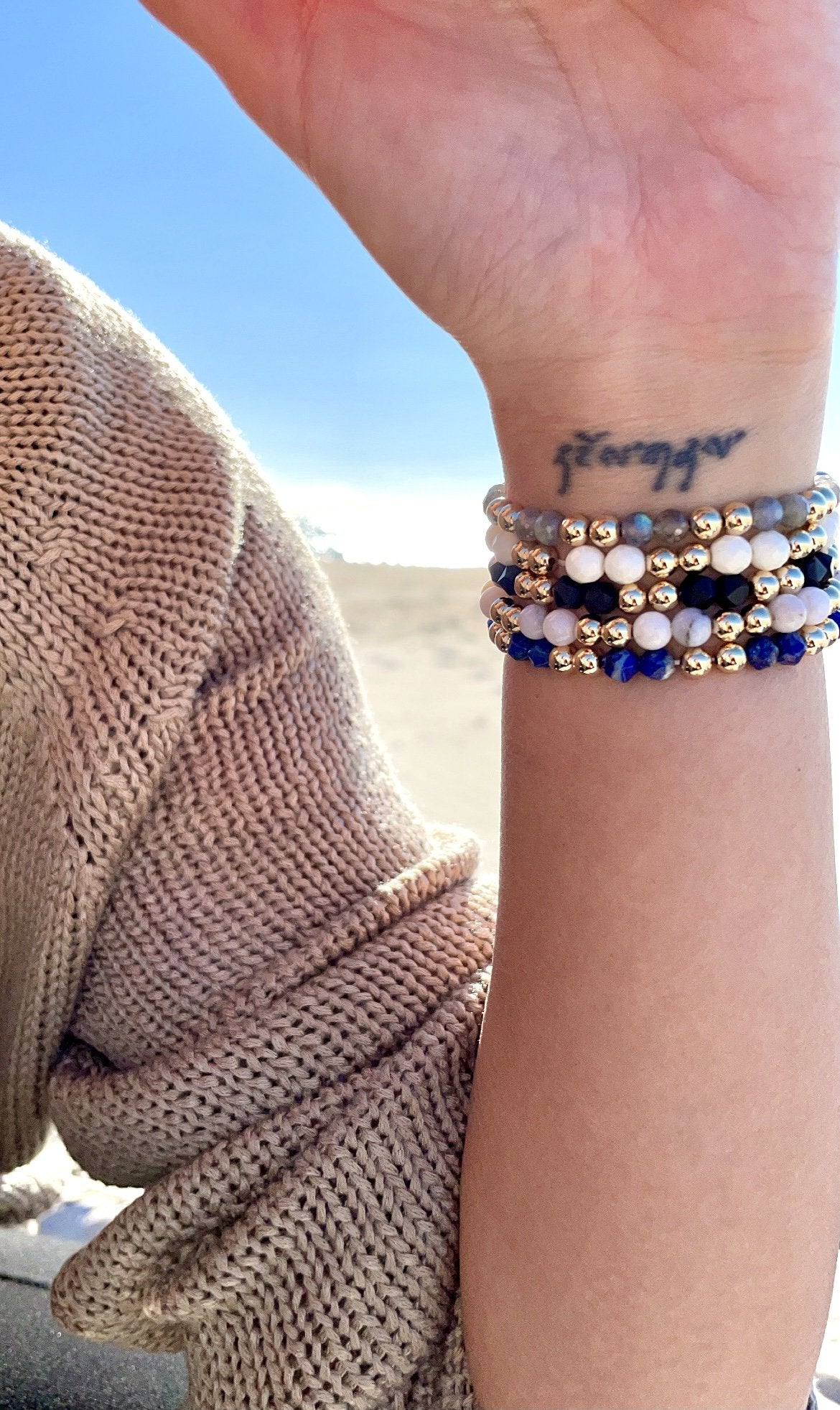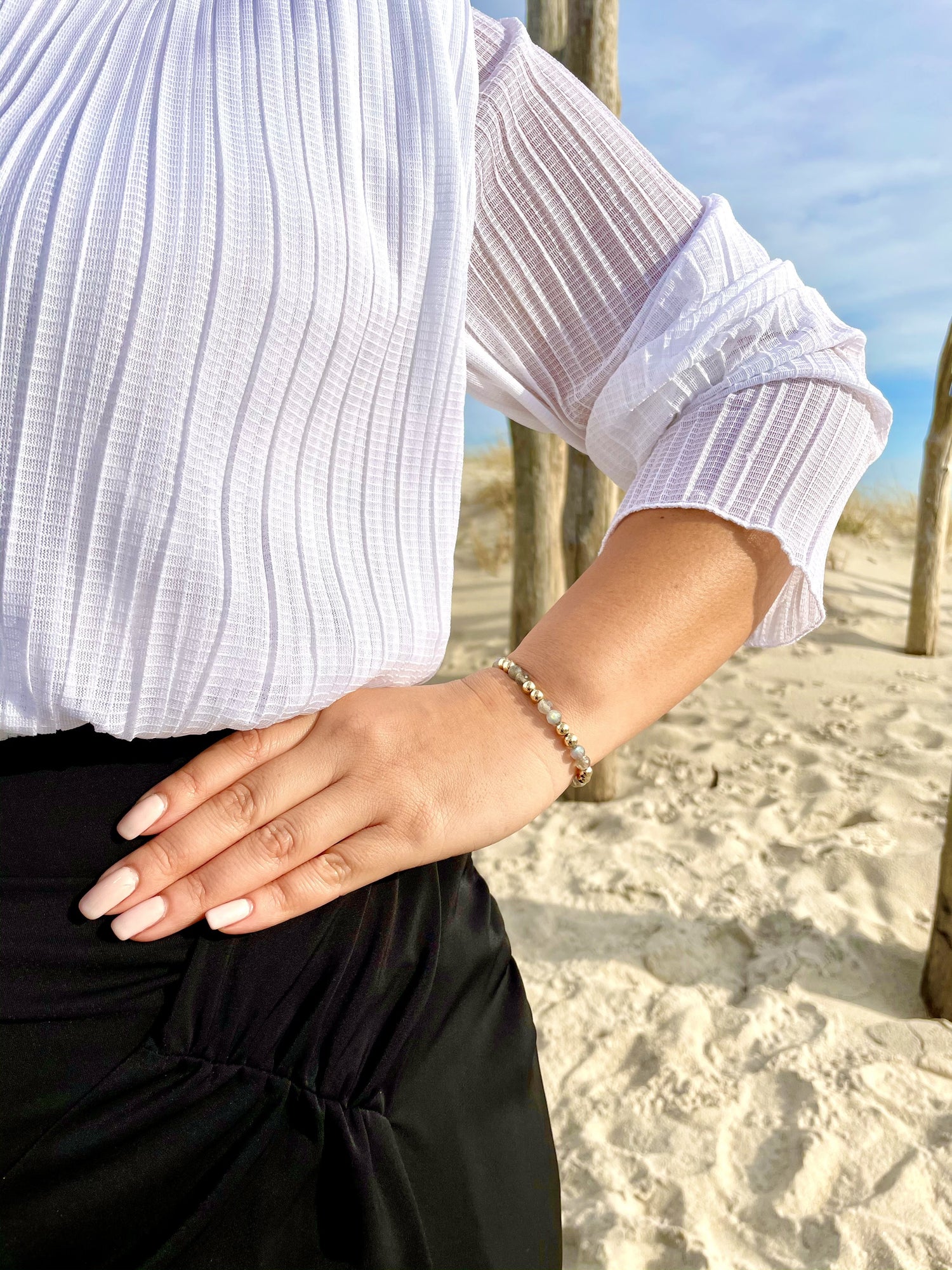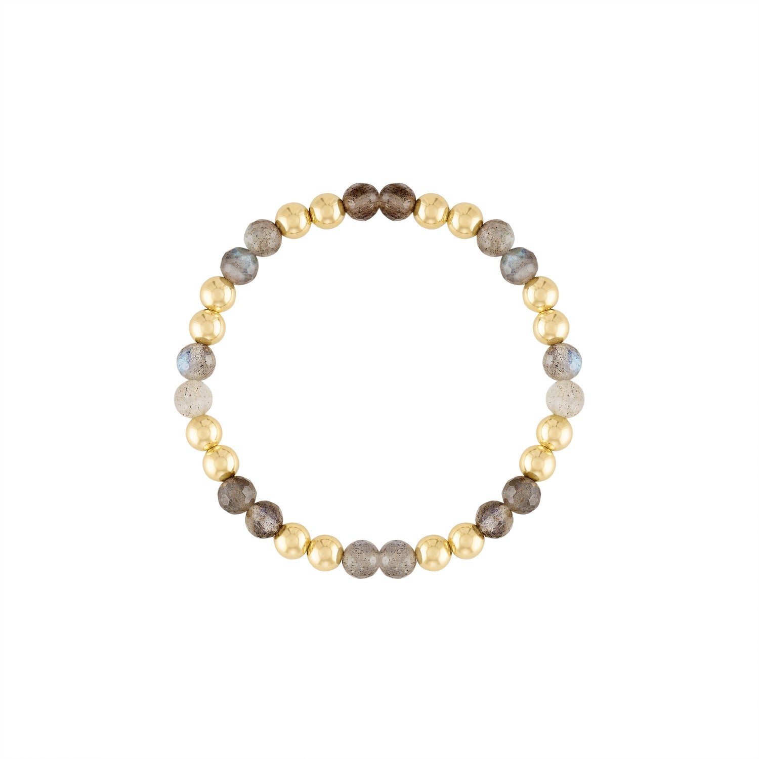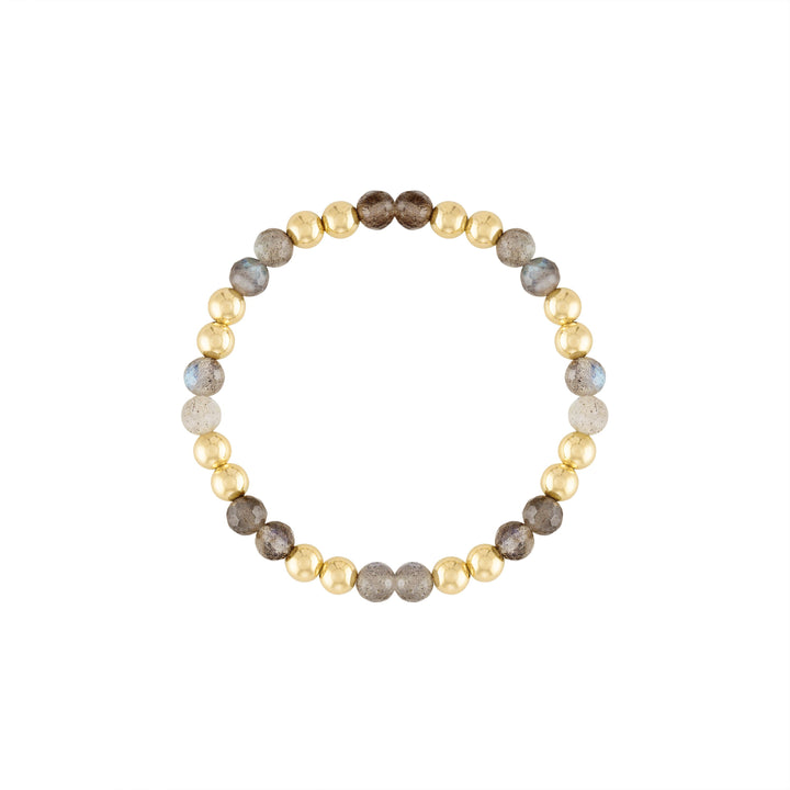 This bracelet is handmade with 14K 5mm gold-filled beads and 5mm faceted labradorite gemstones, available in a 6.5-inch stretch length.