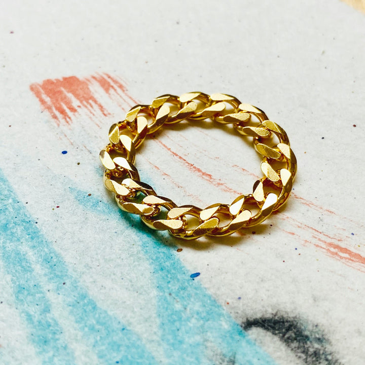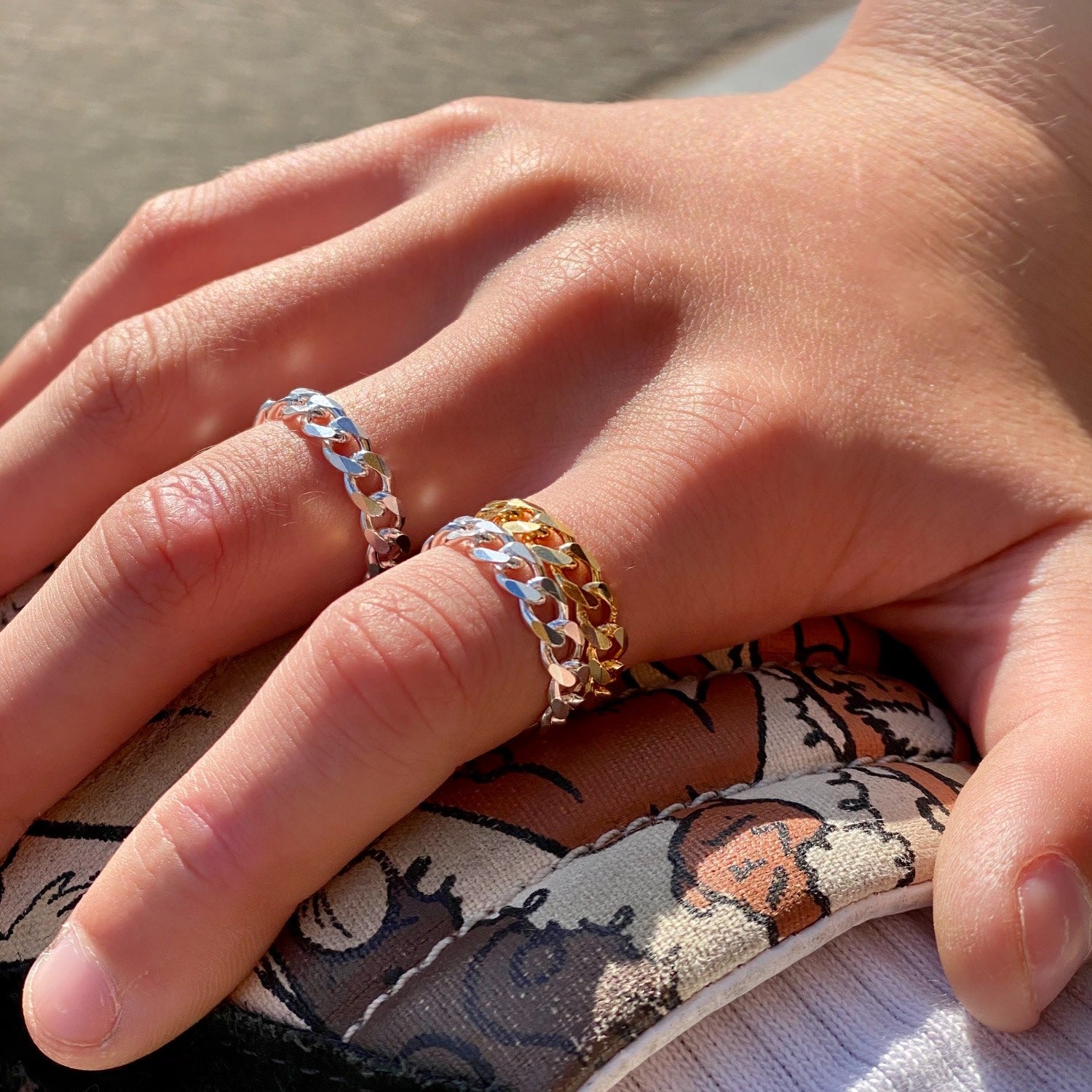The Chain Ring is a comfortable and unique accessory that molds to your finger. The chunky chain band is soft and flexible, making it extremely comfortable to wear on its own or stacked with other rings.