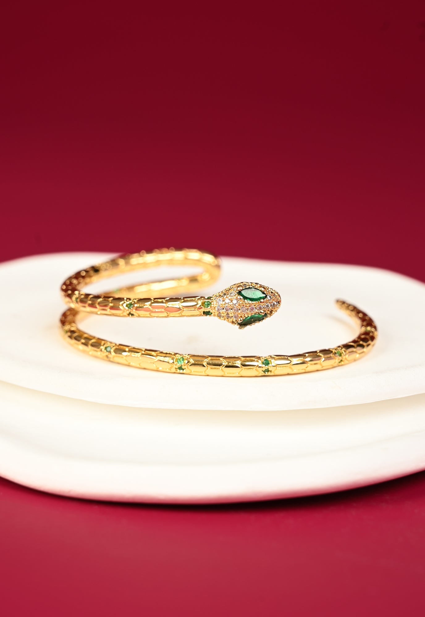 This Snake 'Little Dragon' Cuff Bracelet by Starfish Project is a bold and elegant accessory. Inspired by the strength and resilience of the snake, this 18K gold-plated cuff is encrusted with shimmering zircon stones and features eye-catching emerald green crystal accents. It is designed to wrap gracefully around the wrist, creating a striking, sculptural silhouette. As 2025 is the Lunar Year of the Snake, this bracelet symbolizes transformation and renewal.