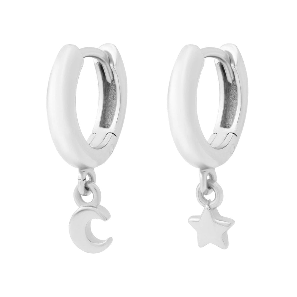 Crafted in silver-tone metal with moon and star charms. Huggie hoop design.