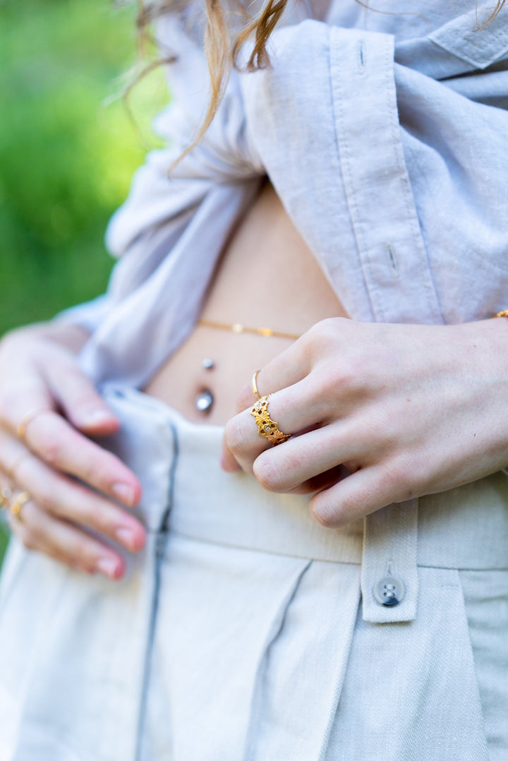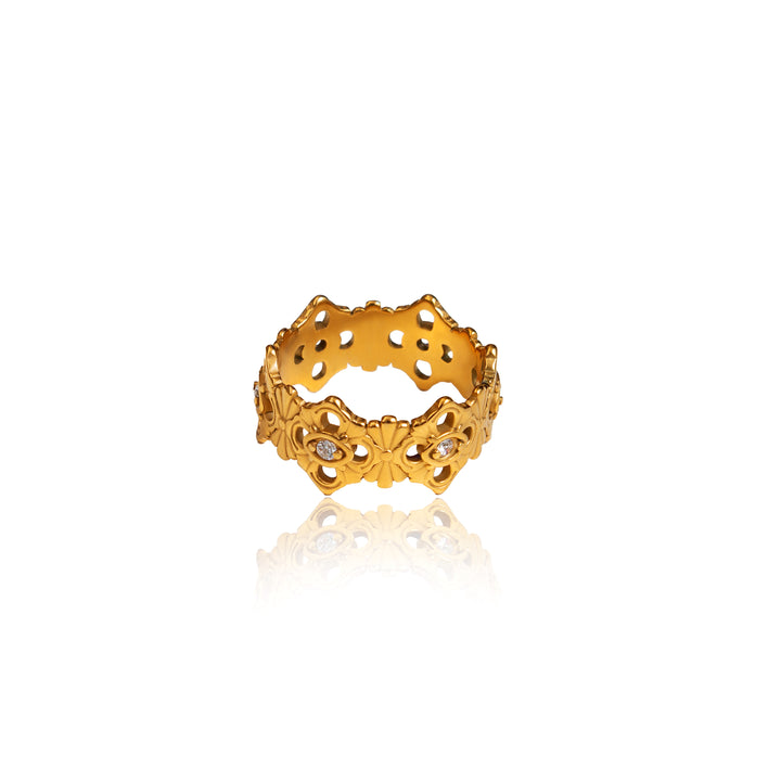 This ring is 18k gold-plated on stainless steel with small stones.