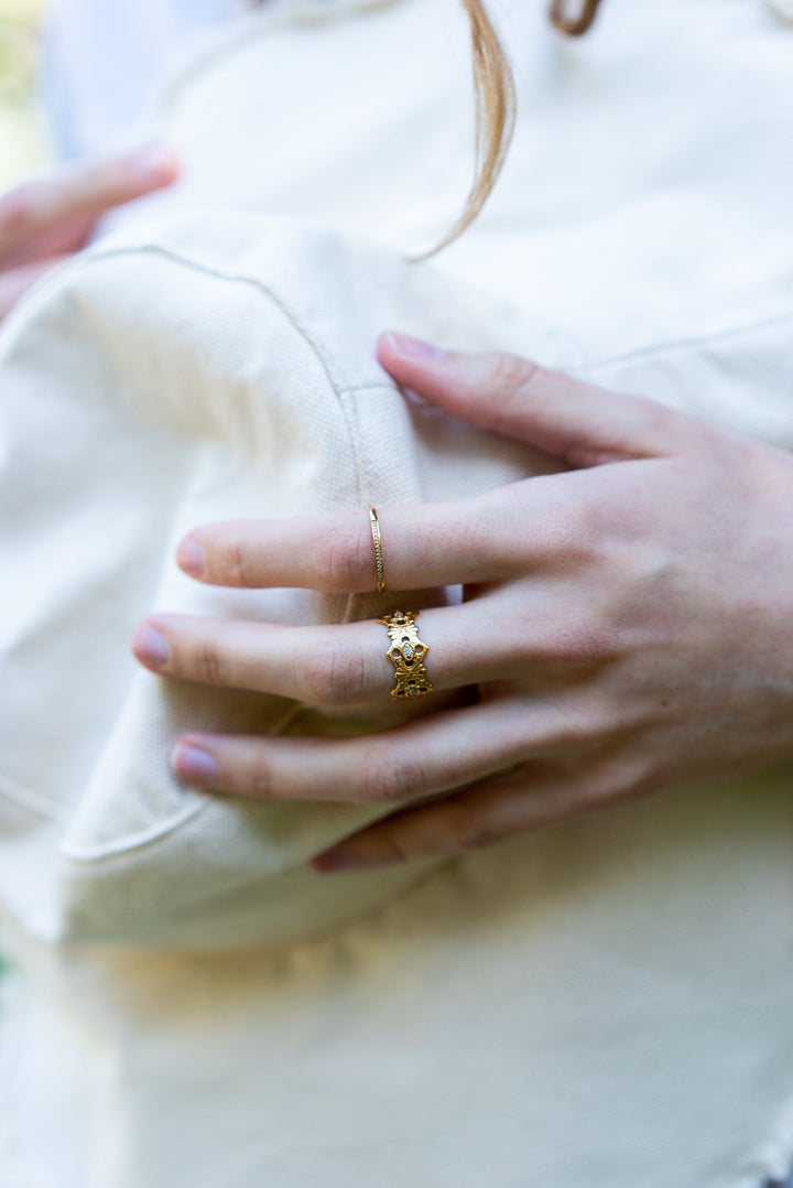 This Park Ring by Tseatjewelry is a vintage-inspired piece with a modern twist. The ring is spotted with small stones for a hint of sparkle, making it a perfect piece for your wardrobe. The 18k gold-plated on stainless steel design ensures a beautiful and durable accessory.