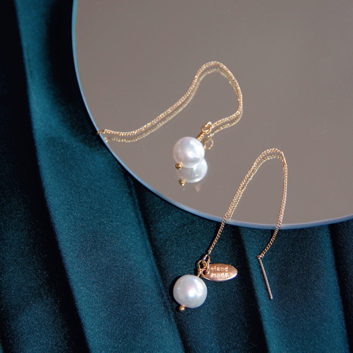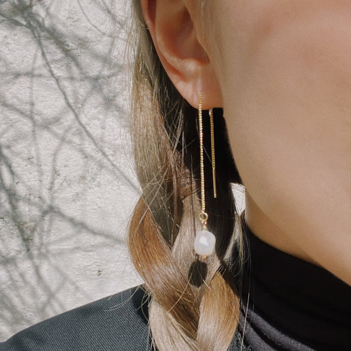 These Pearl Threader Earrings by Ninemoo embody the natural beauty of the sea. Freshwater pearls, often called “mermaid’s tears,” are polished and suspended delicately to glide through the ear with fluid grace. A refined statement of purity and femininity, they add timeless allure to any look.